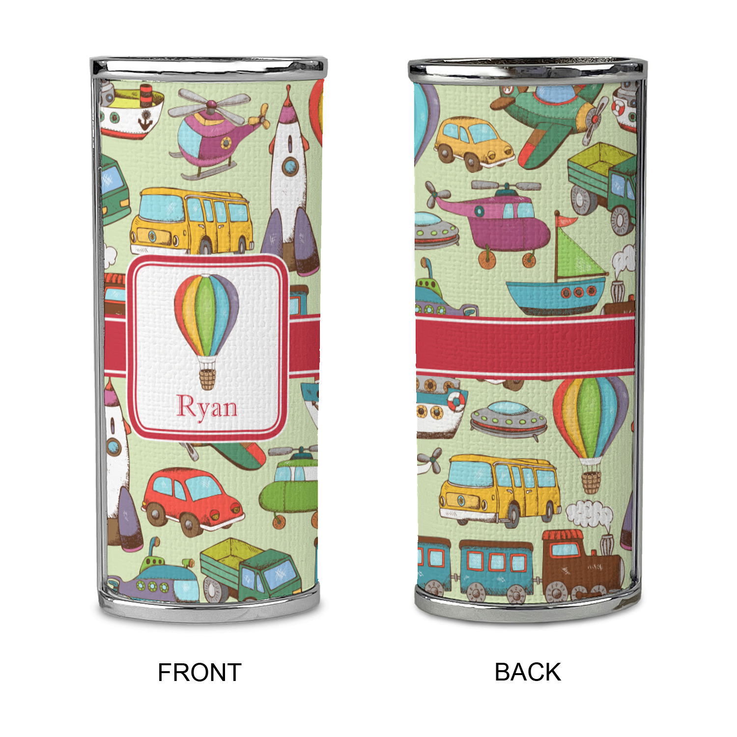 We have featured the various forms of transportation on a soft green background, with a classic red ribbon and square label. The label features a vintage hot air, along with a name for personalization.