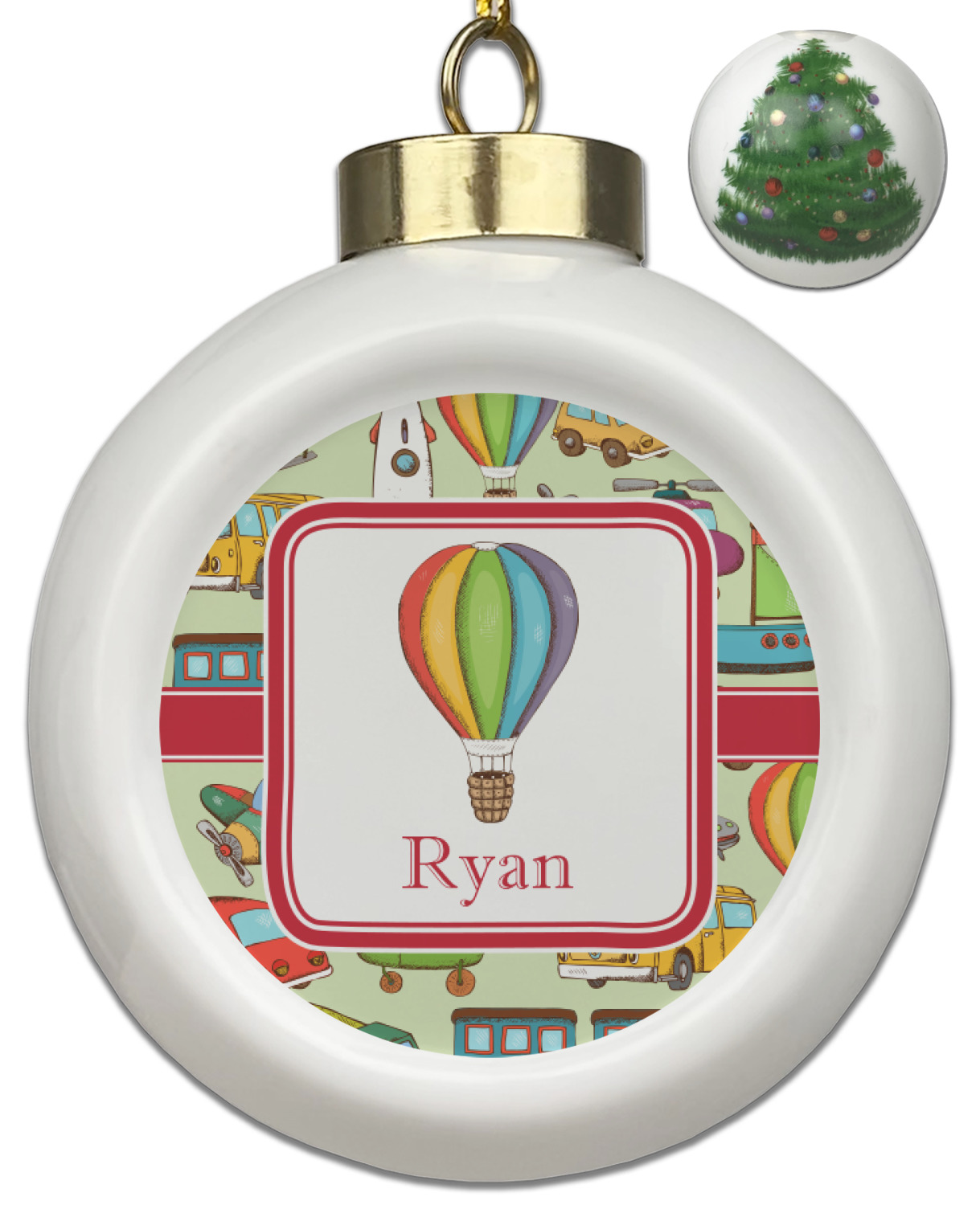 We have featured the various forms of transportation on a soft green background, with a classic red ribbon and square label. The label features a vintage hot air, along with a name for personalization.