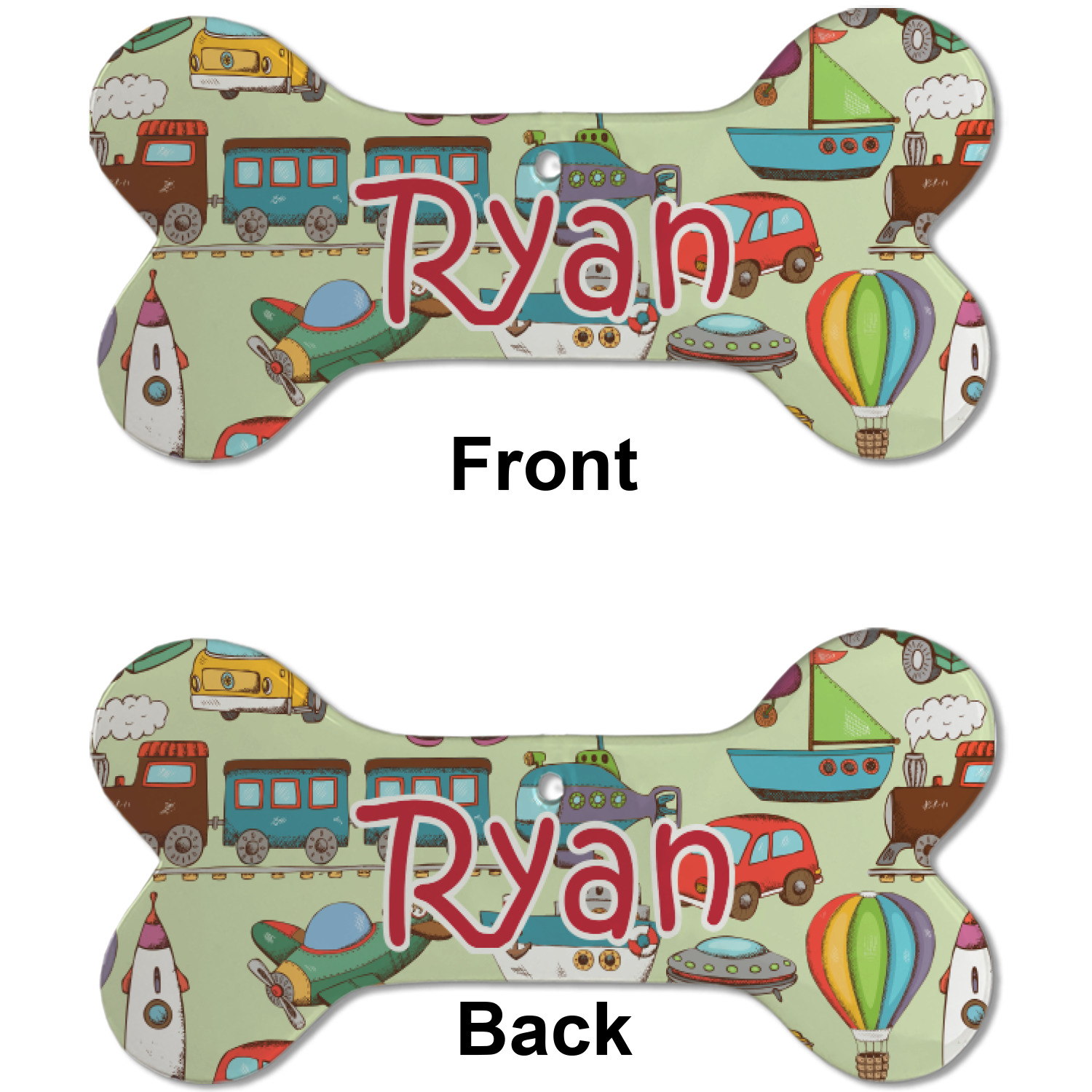 We have featured the various forms of transportation on a soft green background, with a classic red ribbon and square label. The label features a vintage hot air, along with a name for personalization.