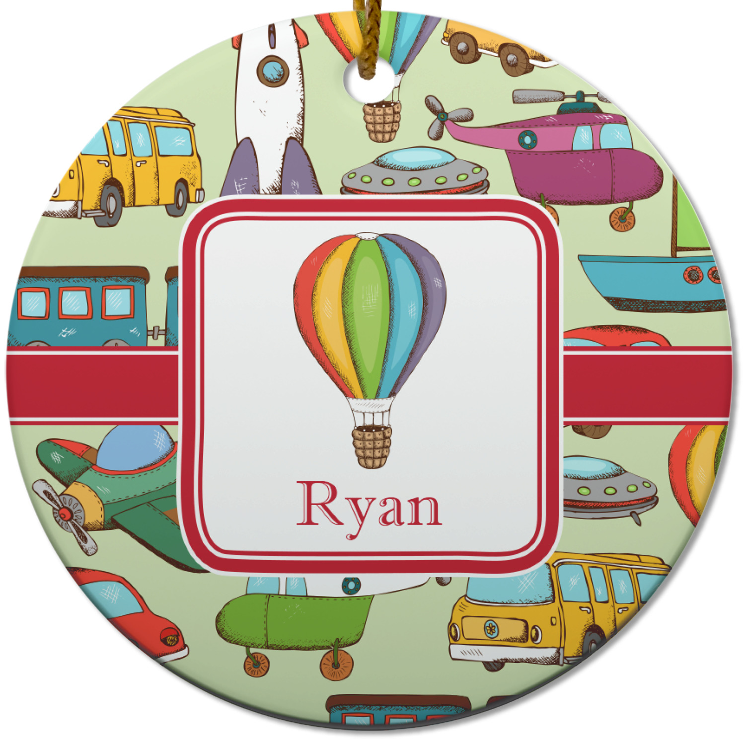 We have featured the various forms of transportation on a soft green background, with a classic red ribbon and square label. The label features a vintage hot air, along with a name for personalization.