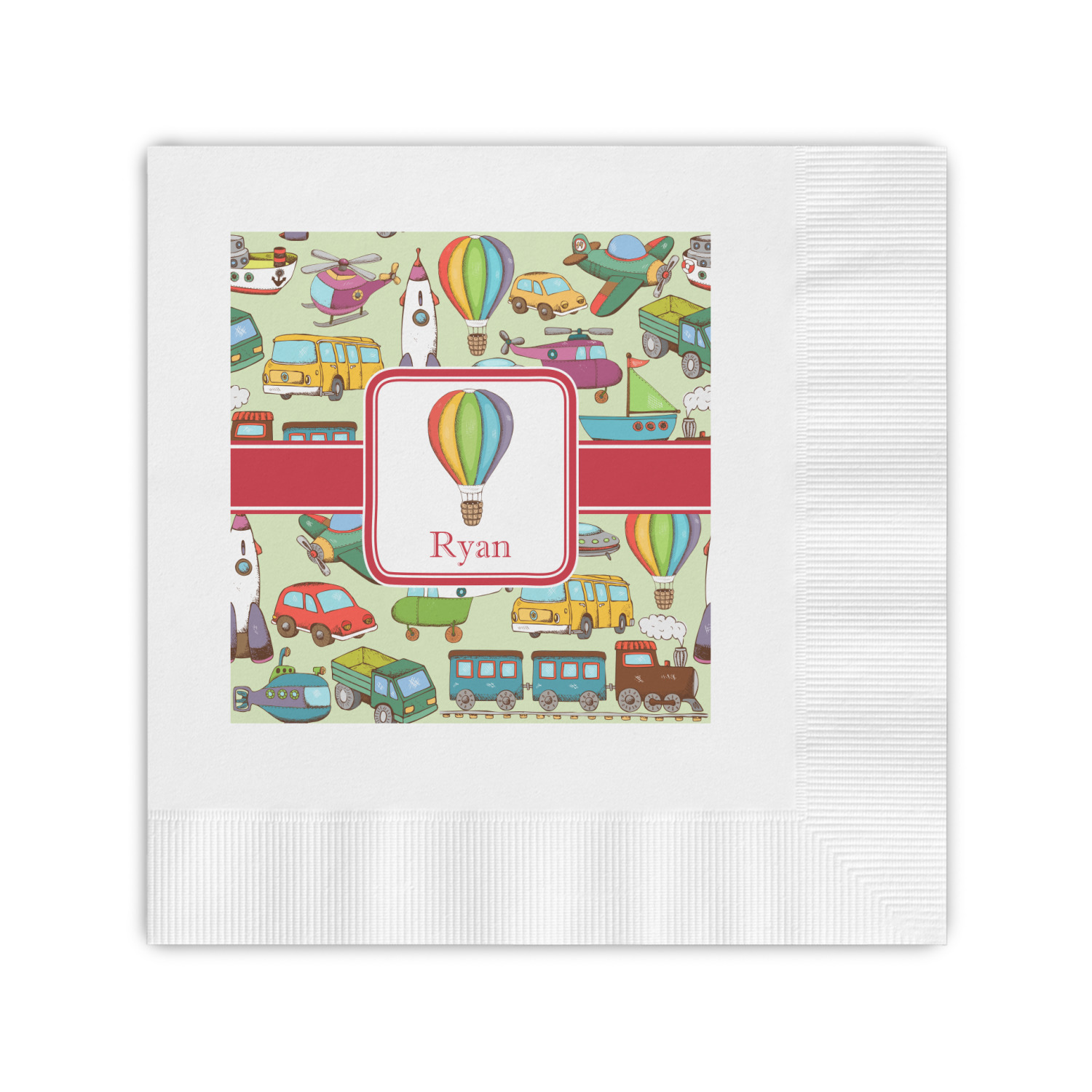 We have featured the various forms of transportation on a soft green background, with a classic red ribbon and square label. The label features a vintage hot air, along with a name for personalization.
