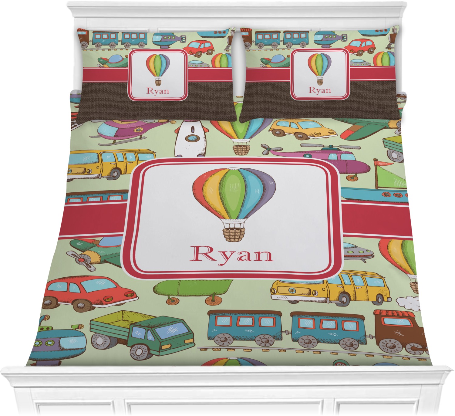 We have featured the various forms of transportation on a soft green background, with a classic red ribbon and square label. The label features a vintage hot air, along with a name for personalization.