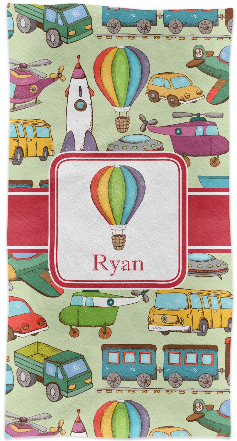 We have featured the various forms of transportation on a soft green background, with a classic red ribbon and square label. The label features a vintage hot air, along with a name for personalization.