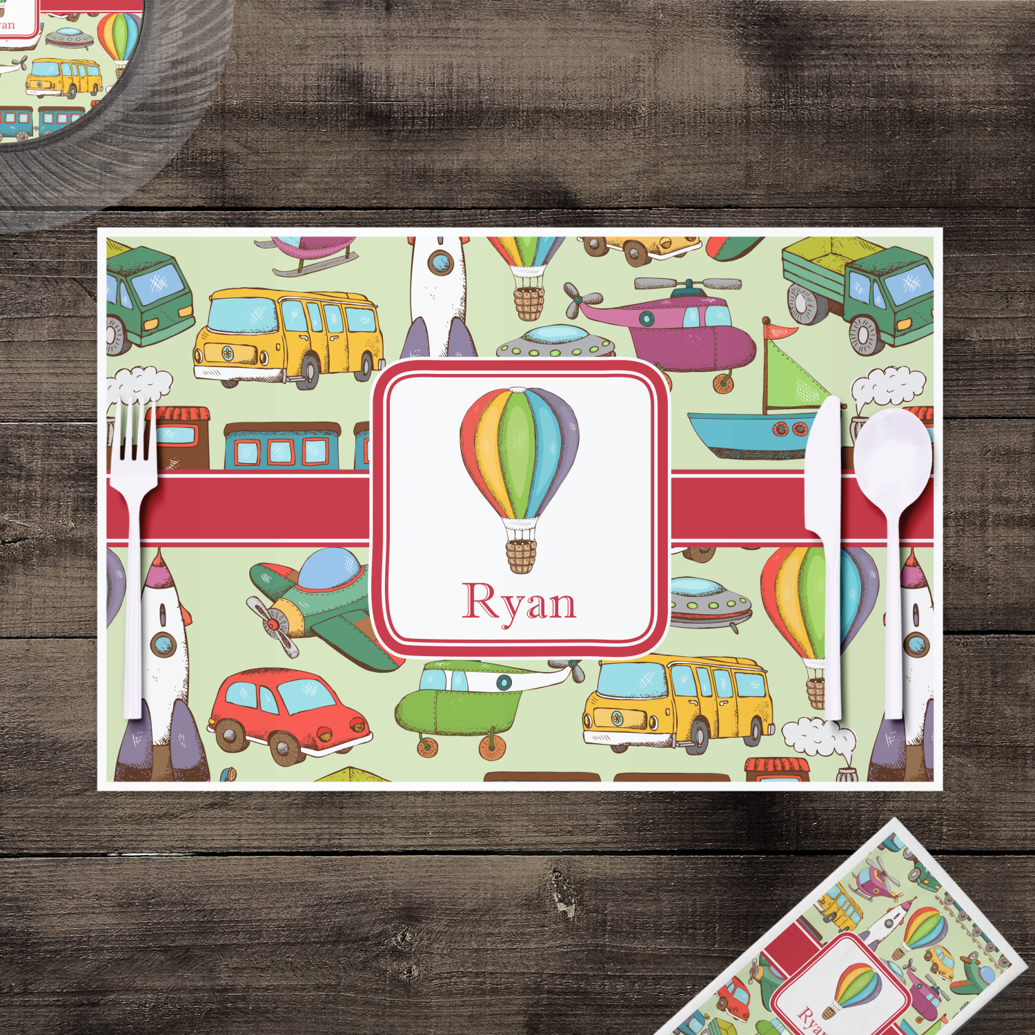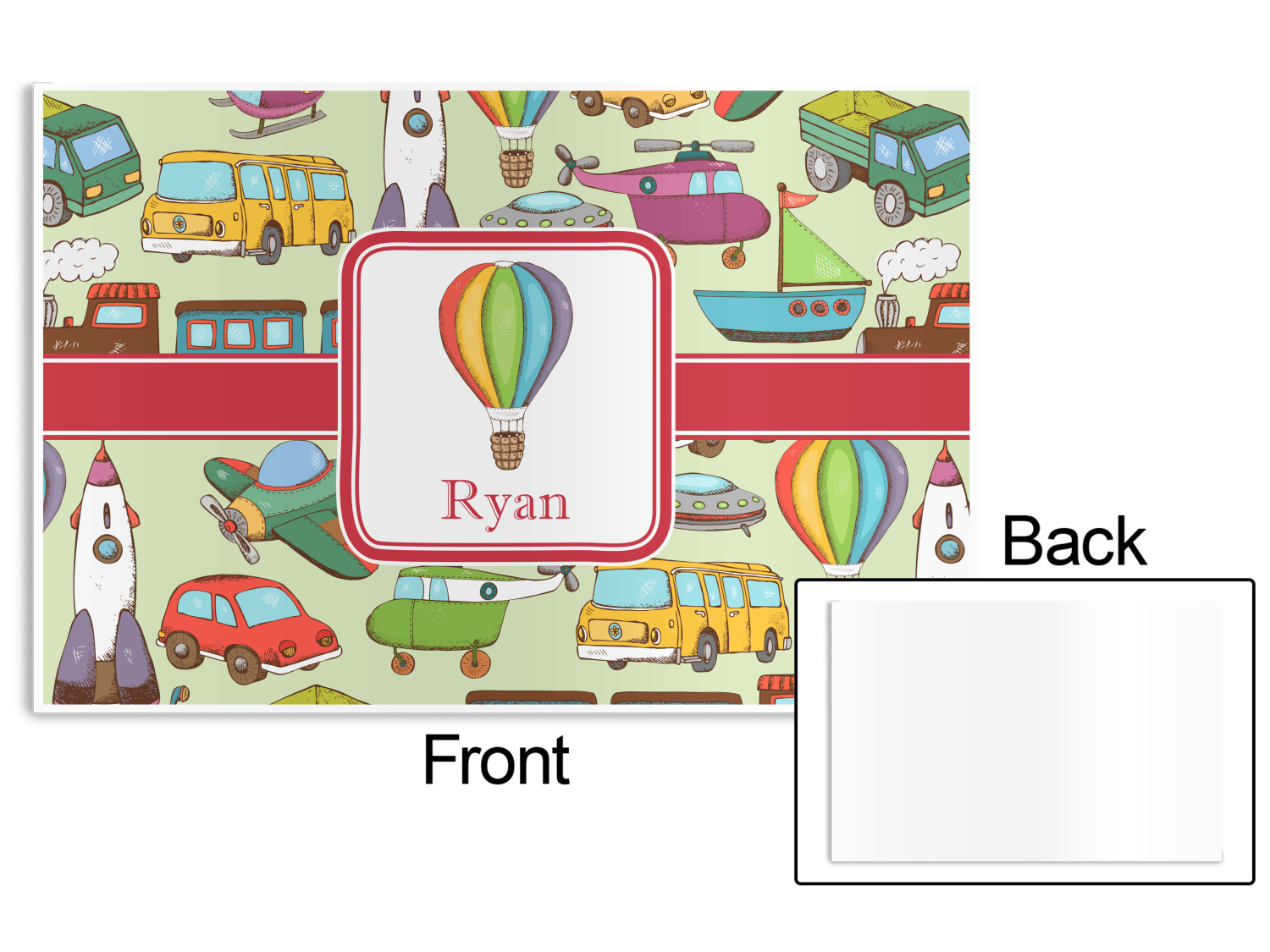 We have featured the various forms of transportation on a soft green background, with a classic red ribbon and square label. The label features a vintage hot air, along with a name for personalization.