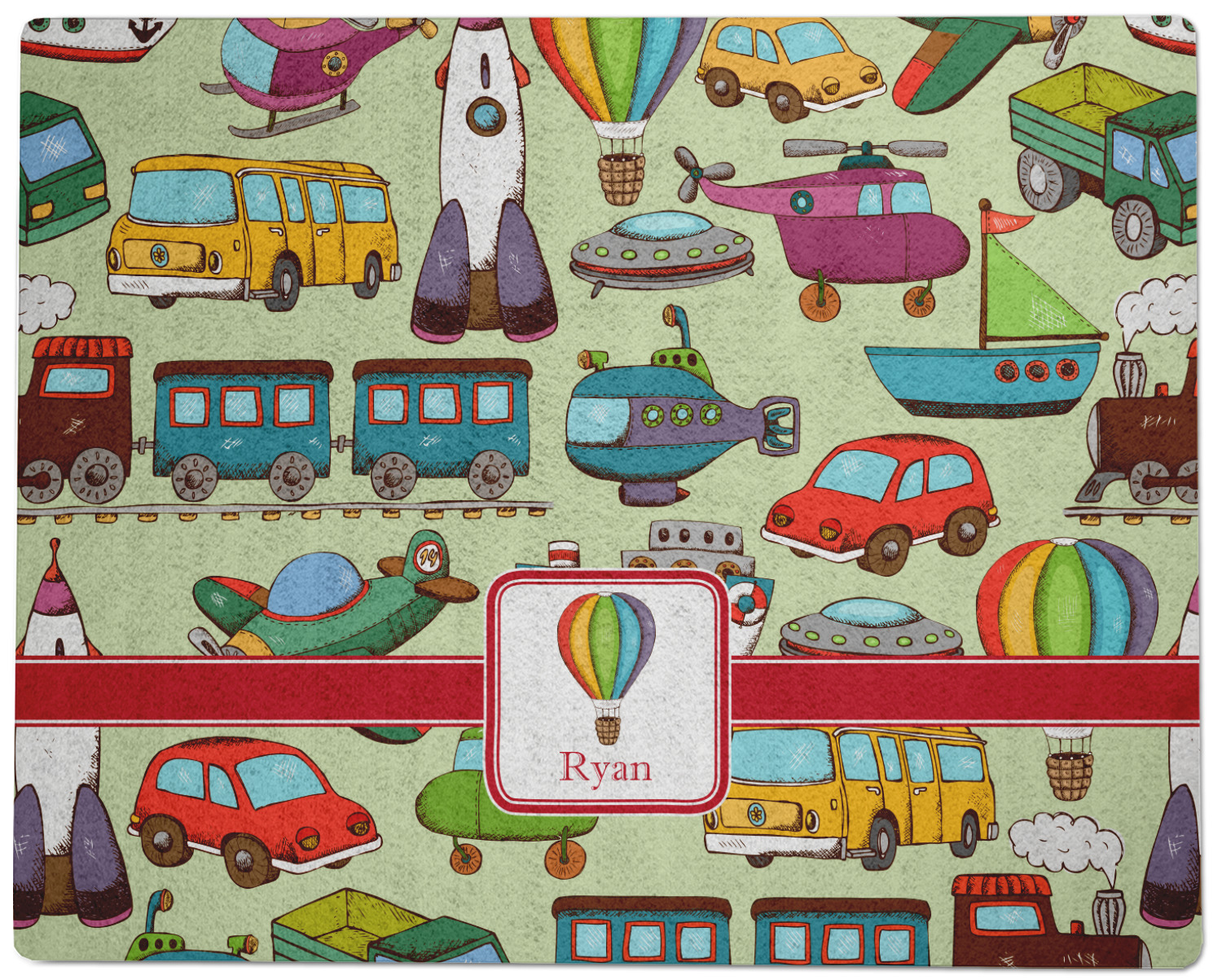 We have featured the various forms of transportation on a soft green background, with a classic red ribbon and square label. The label features a vintage hot air, along with a name for personalization.