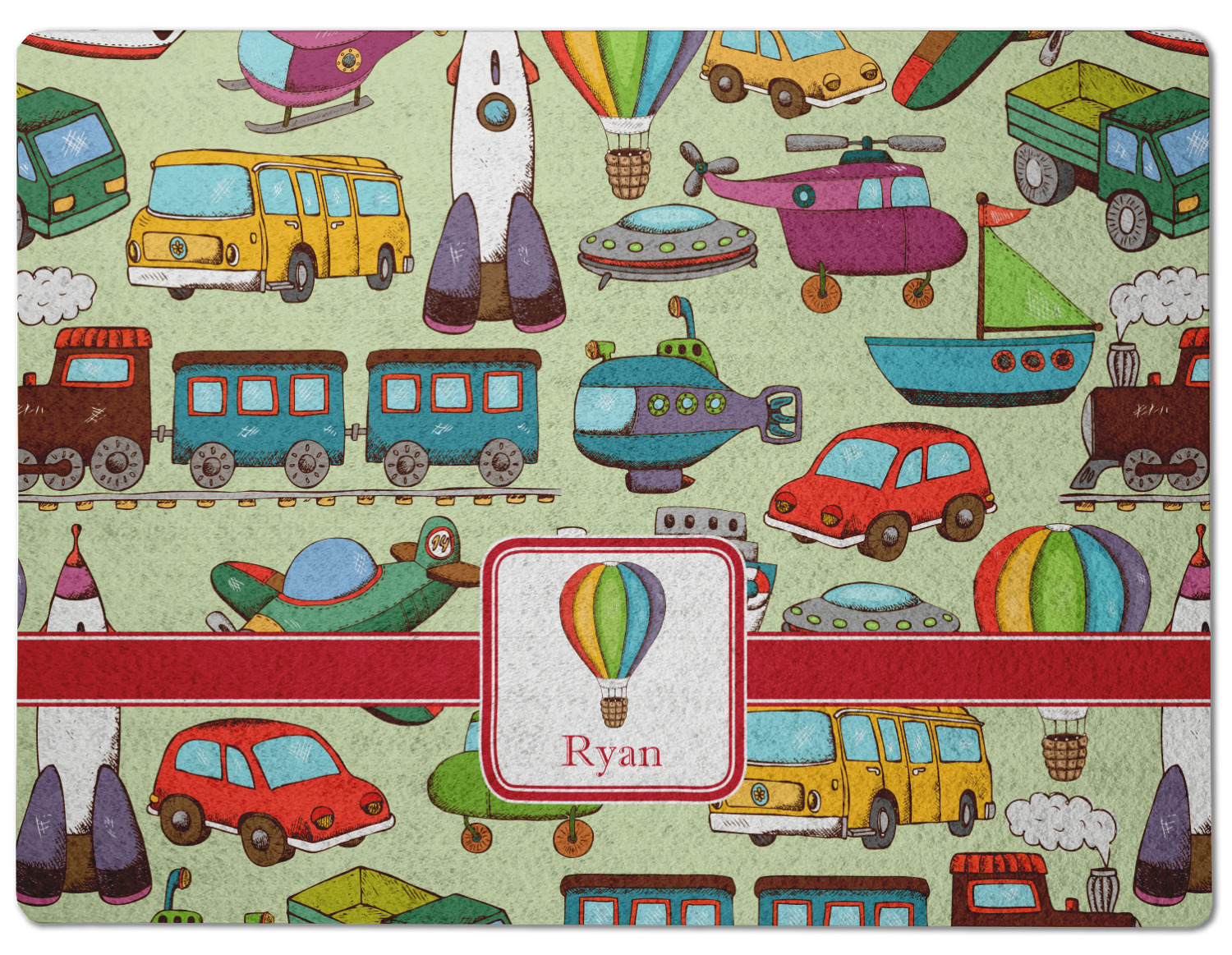 We have featured the various forms of transportation on a soft green background, with a classic red ribbon and square label. The label features a vintage hot air, along with a name for personalization.