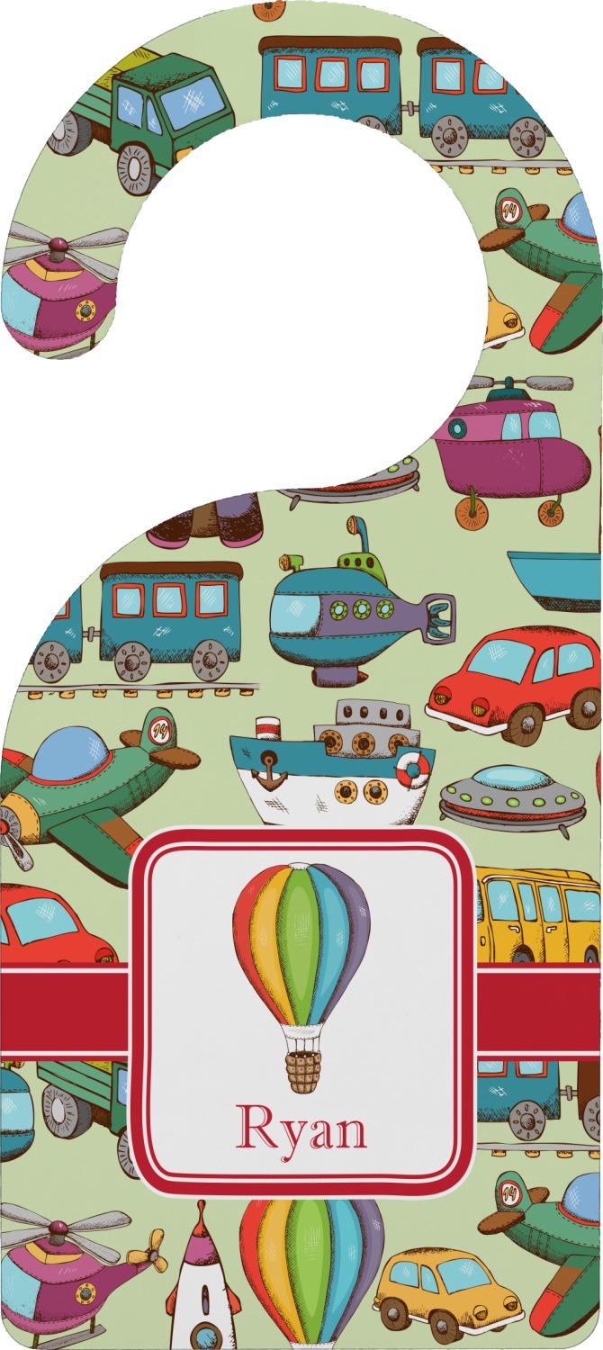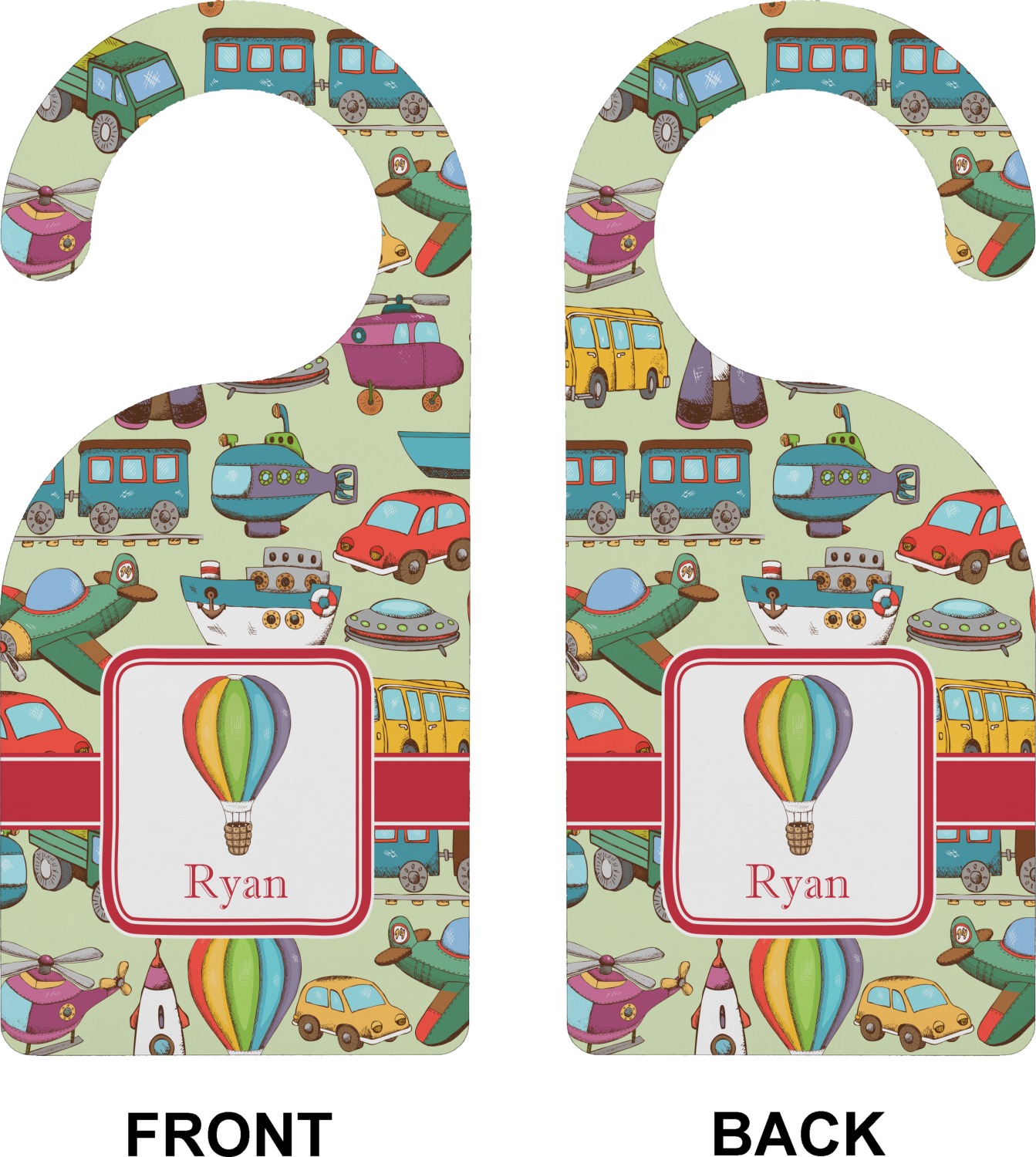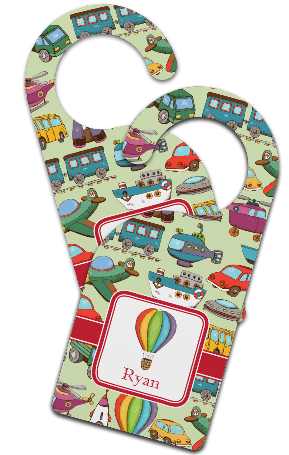 We have featured the various forms of transportation on a soft green background, with a classic red ribbon and square label. The label features a vintage hot air, along with a name for personalization.