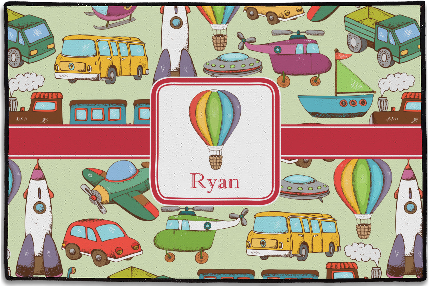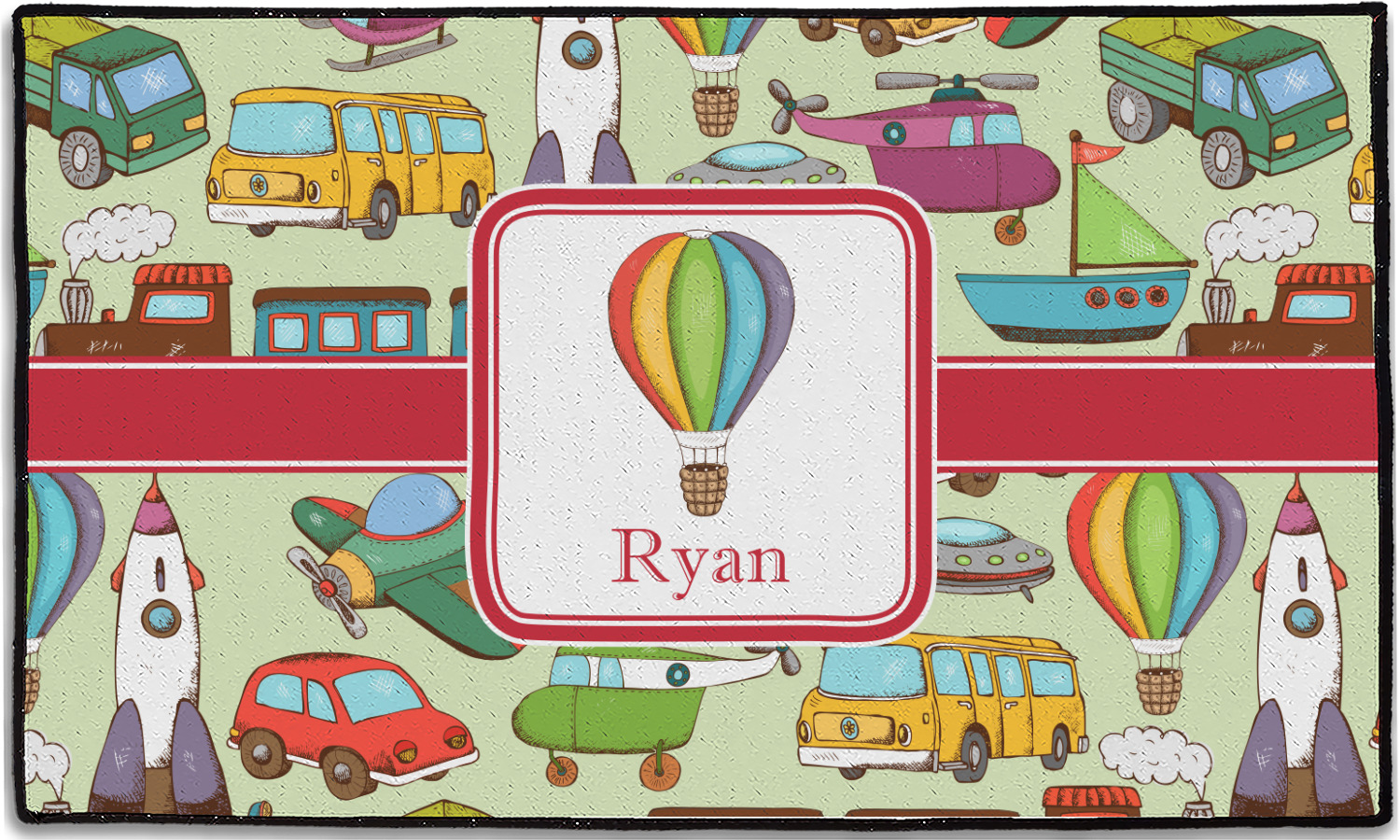 We have featured the various forms of transportation on a soft green background, with a classic red ribbon and square label. The label features a vintage hot air, along with a name for personalization.