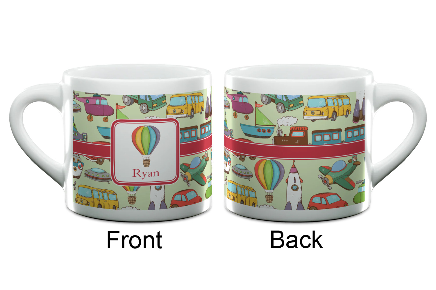 We have featured the various forms of transportation on a soft green background, with a classic red ribbon and square label. The label features a vintage hot air, along with a name for personalization.