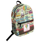 We have featured the various forms of transportation on a soft green background, with a classic red ribbon and square label. The label features a vintage hot air, along with a name for personalization.