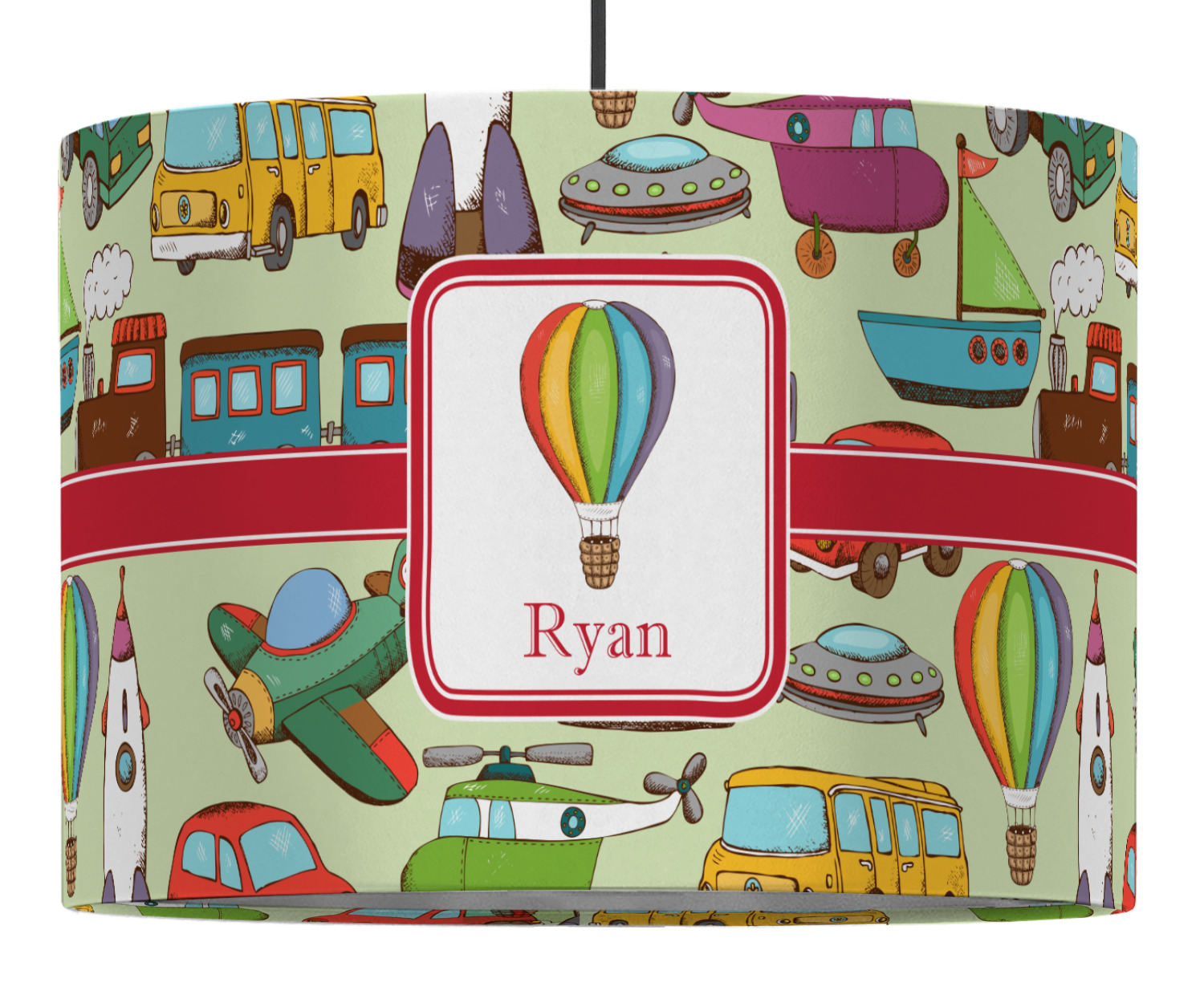 We have featured the various forms of transportation on a soft green background, with a classic red ribbon and square label. The label features a vintage hot air, along with a name for personalization.