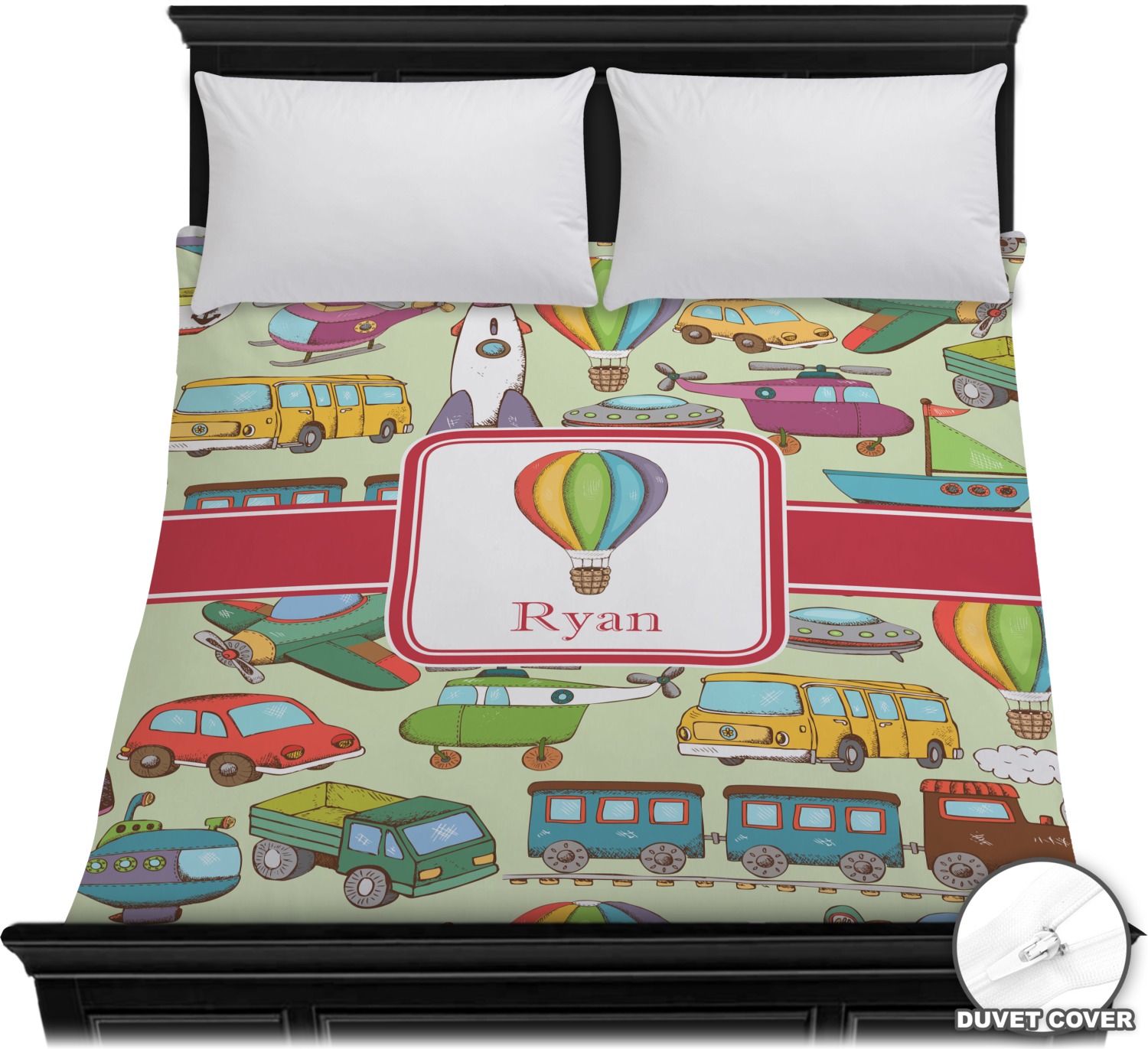 We have featured the various forms of transportation on a soft green background, with a classic red ribbon and square label. The label features a vintage hot air, along with a name for personalization.