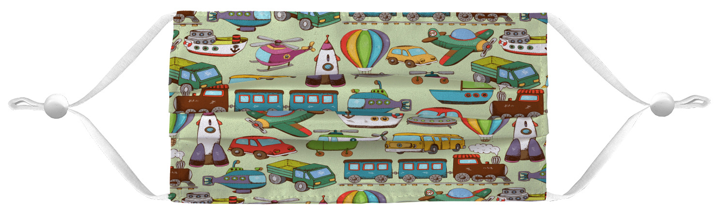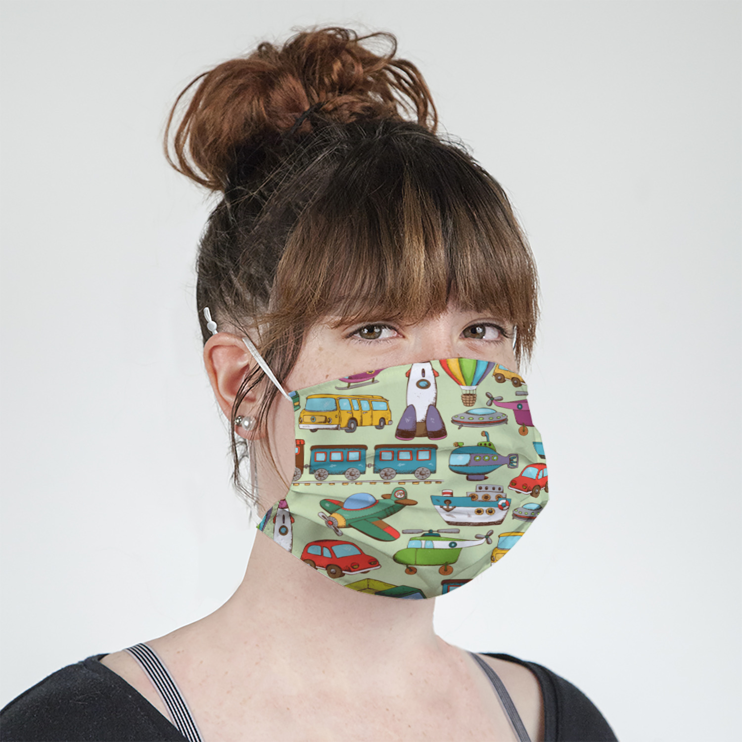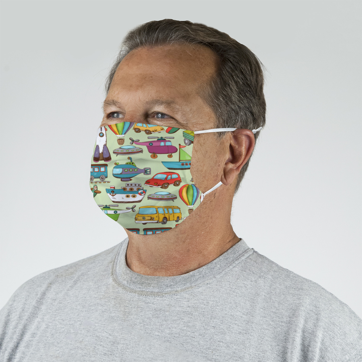 These fun face masks are 7" wide and 3.5" high. They feature pleats, adjustable ear loops, and are made with two layers of fabric. The top layer where your design is printed is a breathable polyester sheeting, while the inside layer is a soft microfiber polyester