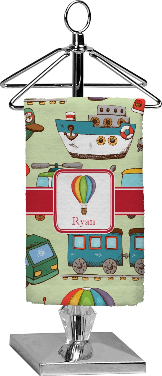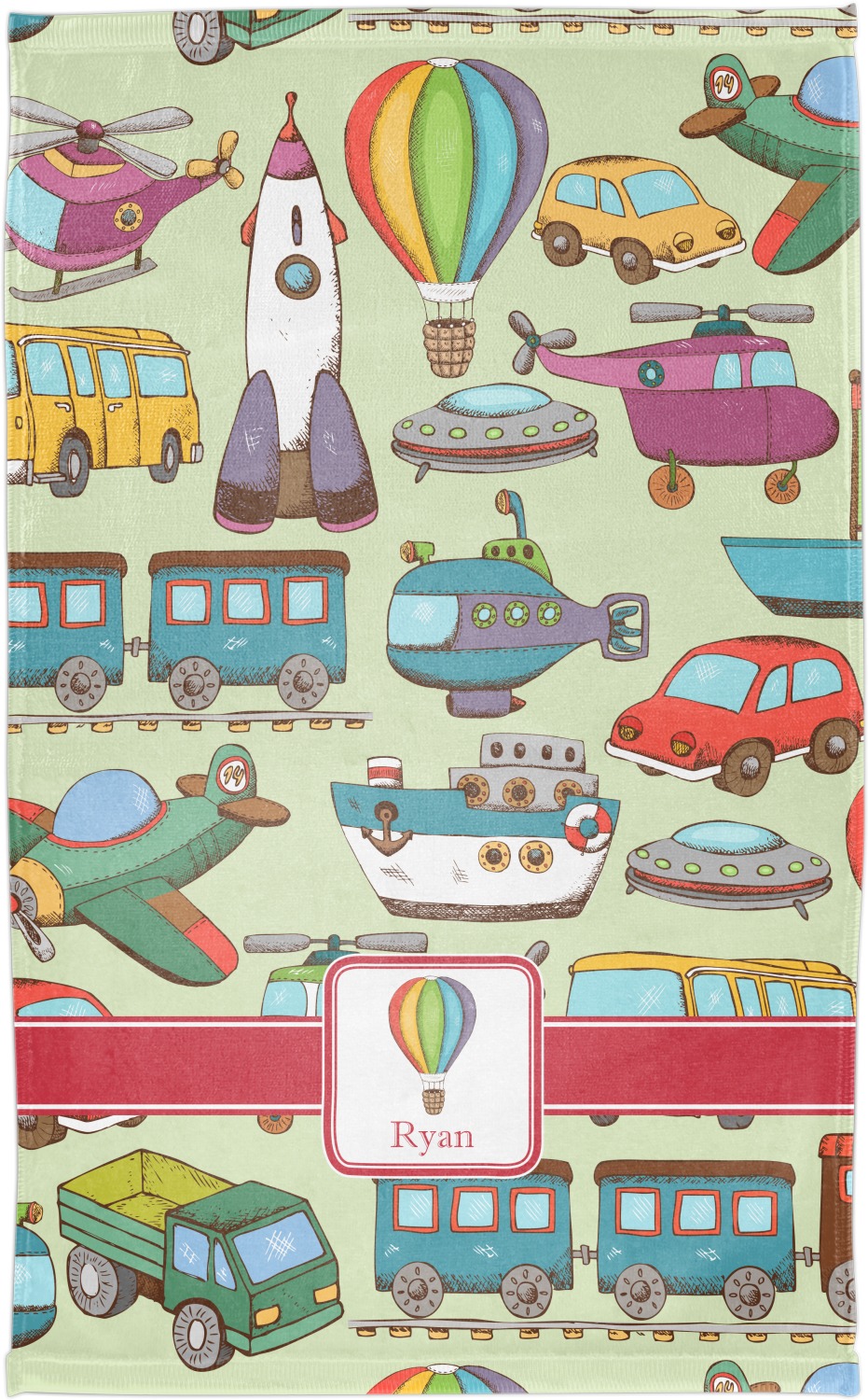 We have featured the various forms of transportation on a soft green background, with a classic red ribbon and square label. The label features a vintage hot air, along with a name for personalization.