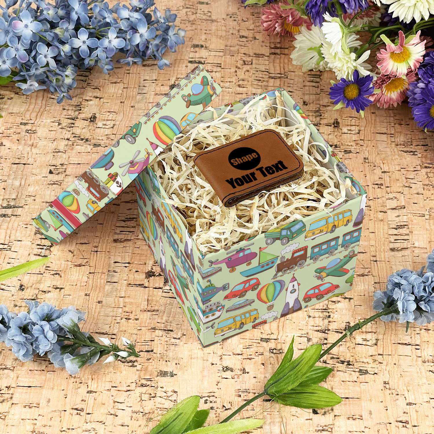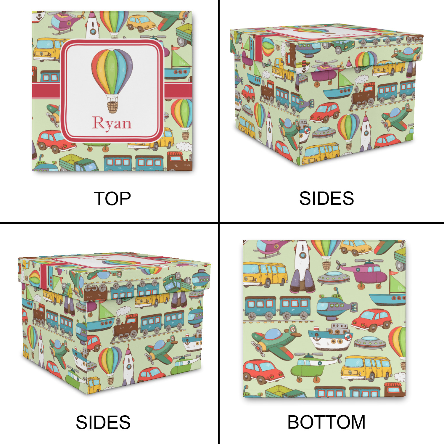 We have featured the various forms of transportation on a soft green background, with a classic red ribbon and square label. The label features a vintage hot air, along with a name for personalization.