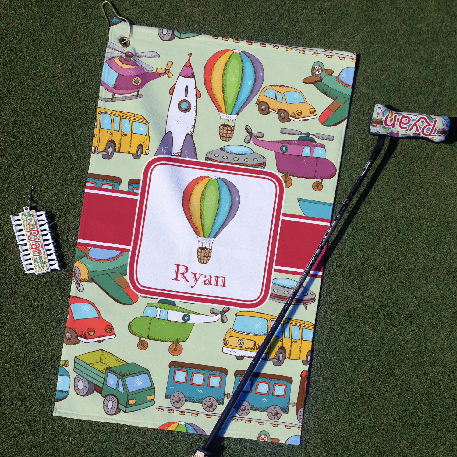 We have featured the various forms of transportation on a soft green background, with a classic red ribbon and square label. The label features a vintage hot air, along with a name for personalization.