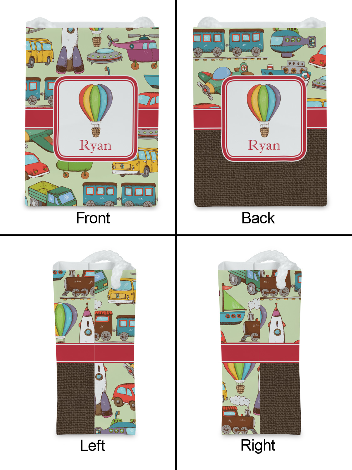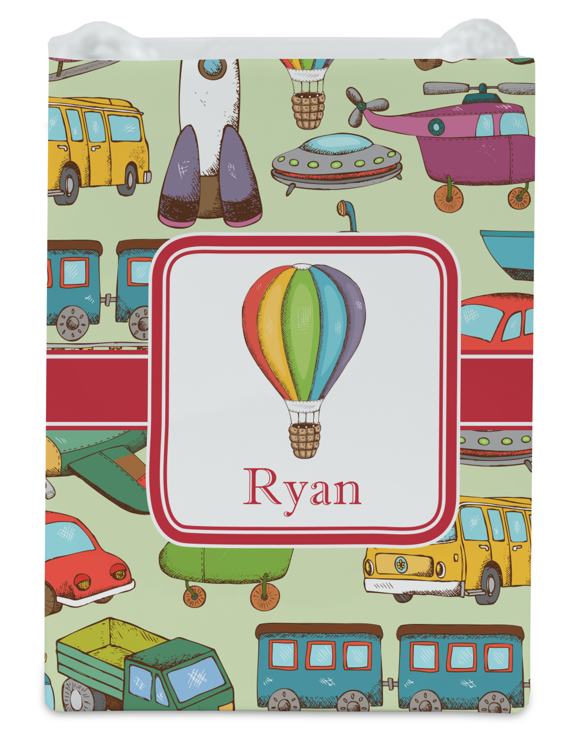 We have featured the various forms of transportation on a soft green background, with a classic red ribbon and square label. The label features a vintage hot air, along with a name for personalization.