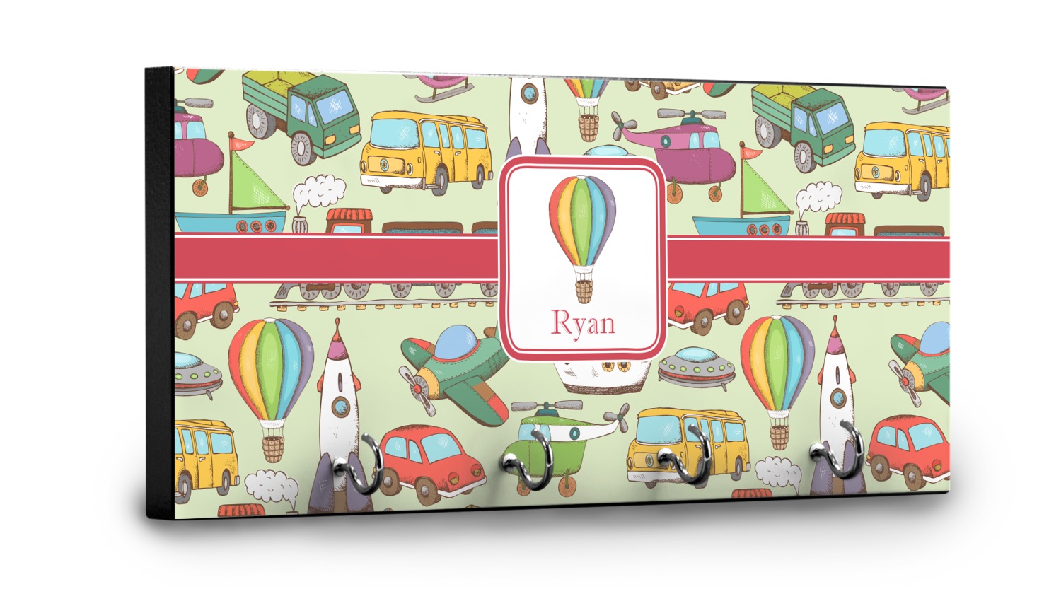 We have featured the various forms of transportation on a soft green background, with a classic red ribbon and square label. The label features a vintage hot air, along with a name for personalization.