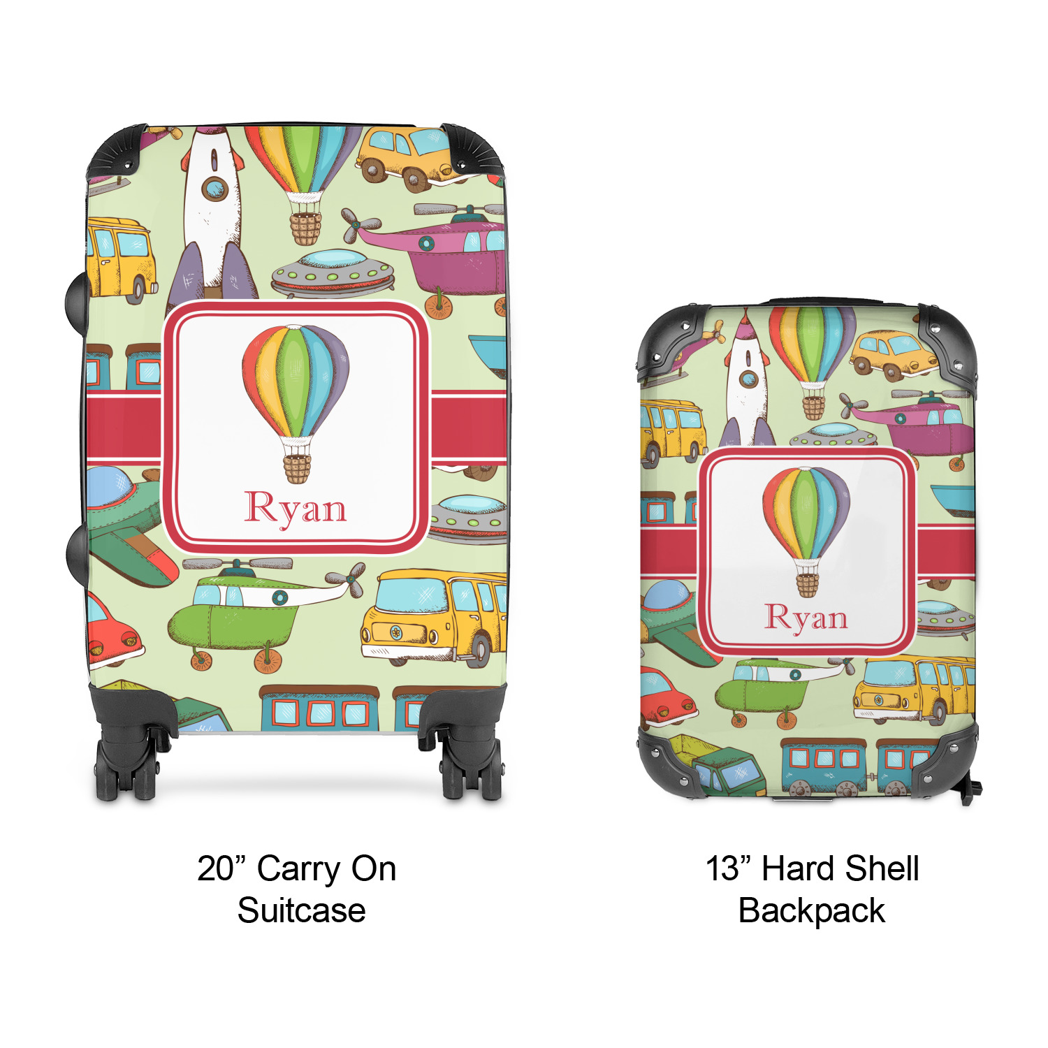 We have featured the various forms of transportation on a soft green background, with a classic red ribbon and square label. The label features a vintage hot air, along with a name for personalization.