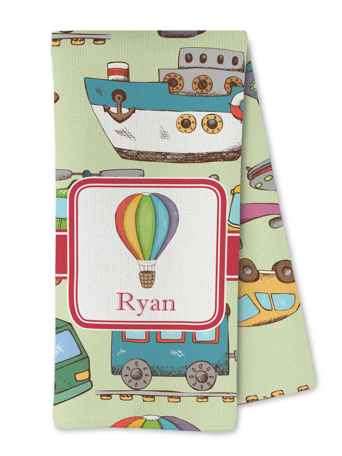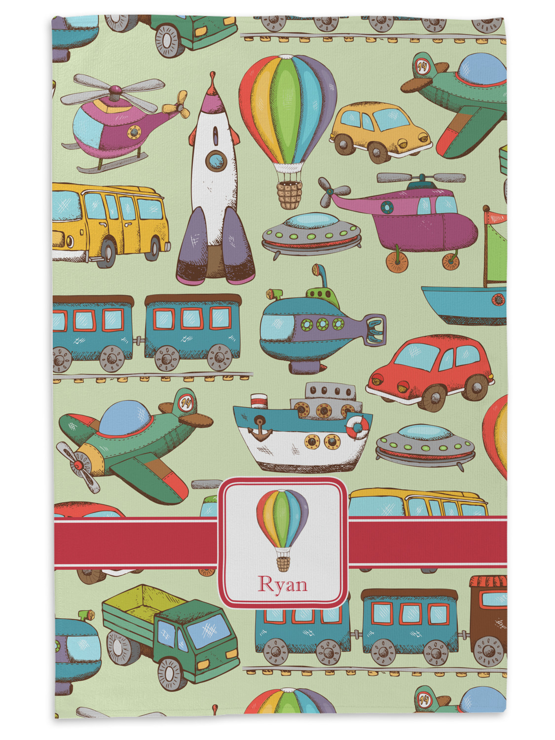 We have featured the various forms of transportation on a soft green background, with a classic red ribbon and square label. The label features a vintage hot air, along with a name for personalization.