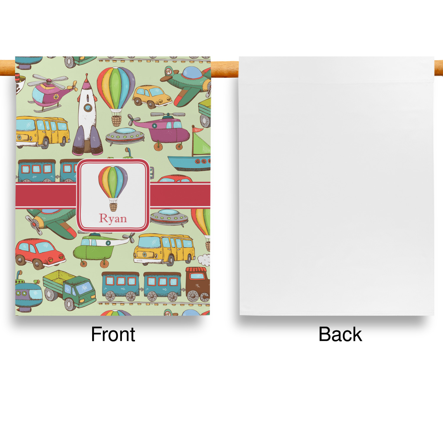 We have featured the various forms of transportation on a soft green background, with a classic red ribbon and square label. The label features a vintage hot air, along with a name for personalization.
