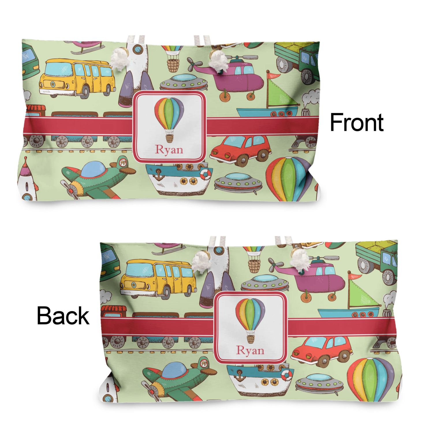 We have featured the various forms of transportation on a soft green background, with a classic red ribbon and square label. The label features a vintage hot air, along with a name for personalization.