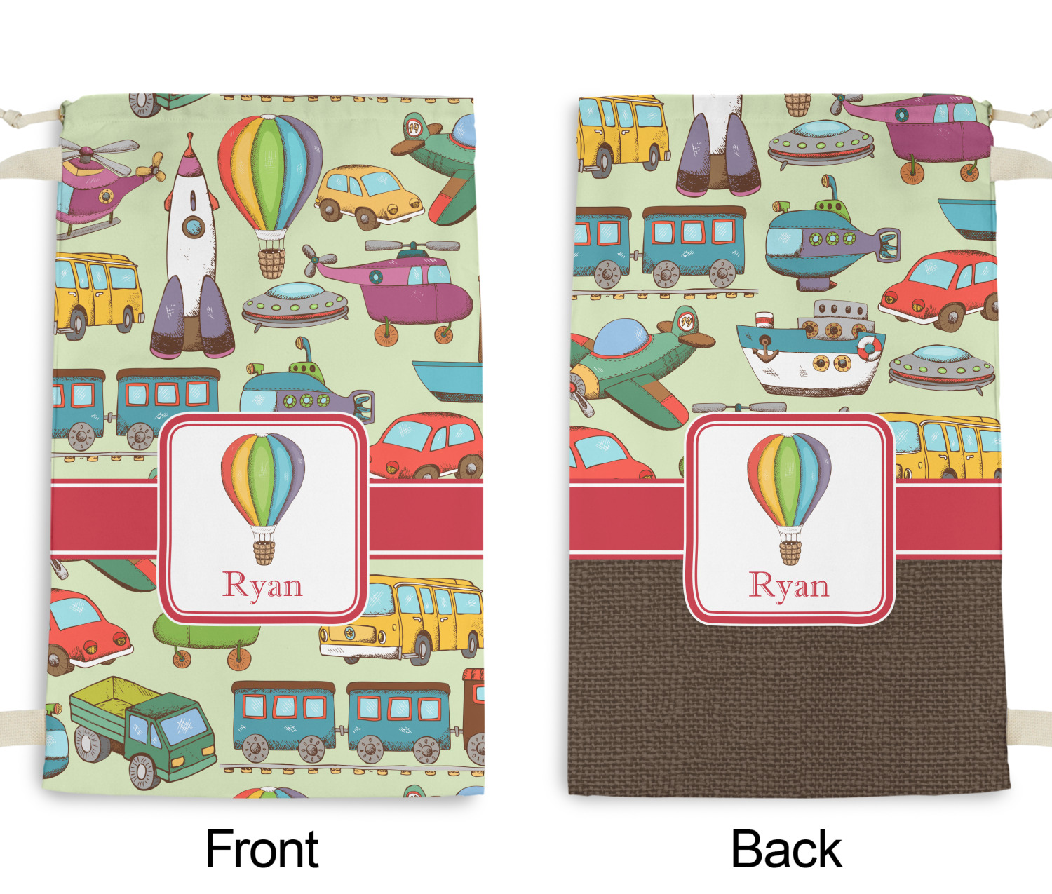 We have featured the various forms of transportation on a soft green background, with a classic red ribbon and square label. The label features a vintage hot air, along with a name for personalization.
