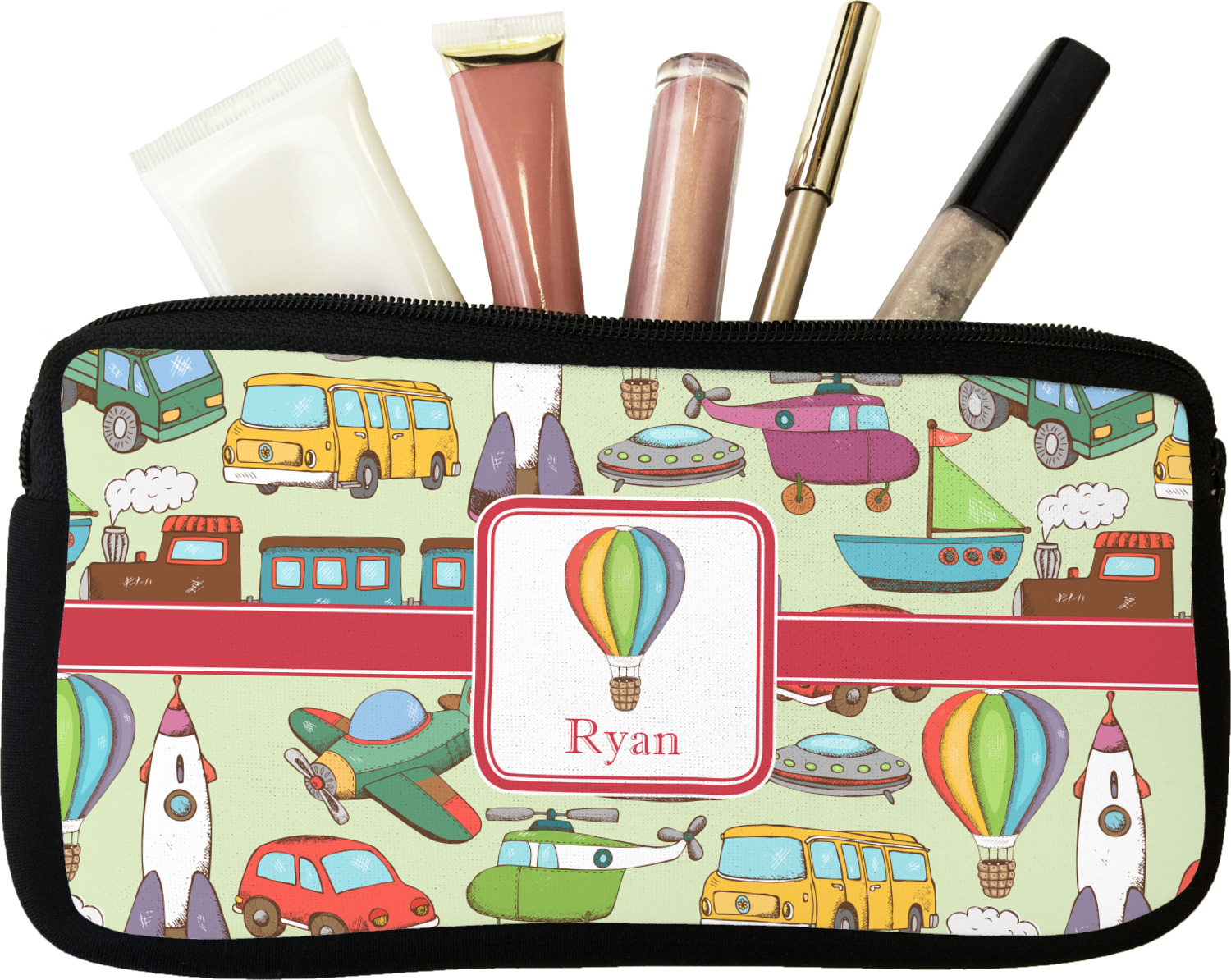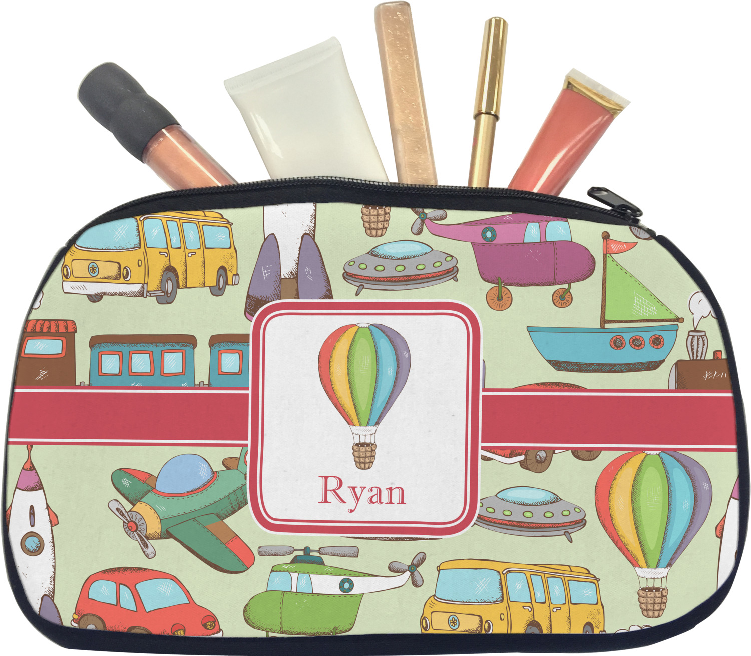 We have featured the various forms of transportation on a soft green background, with a classic red ribbon and square label. The label features a vintage hot air, along with a name for personalization.