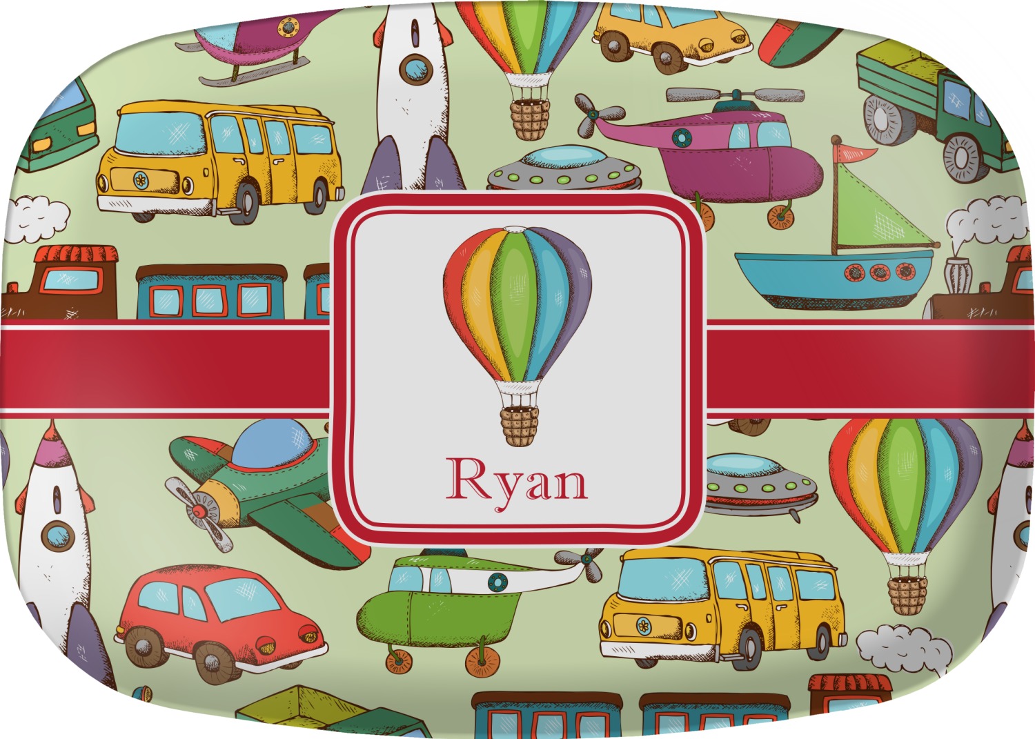 We have featured the various forms of transportation on a soft green background, with a classic red ribbon and square label. The label features a vintage hot air, along with a name for personalization.