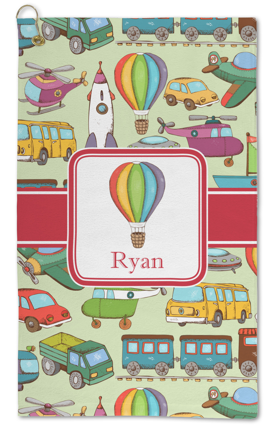 We have featured the various forms of transportation on a soft green background, with a classic red ribbon and square label. The label features a vintage hot air, along with a name for personalization.
