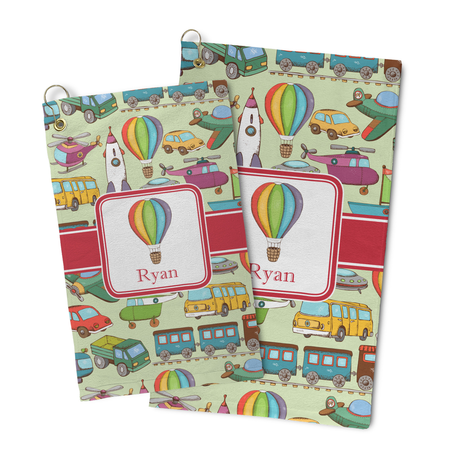 We have featured the various forms of transportation on a soft green background, with a classic red ribbon and square label. The label features a vintage hot air, along with a name for personalization.