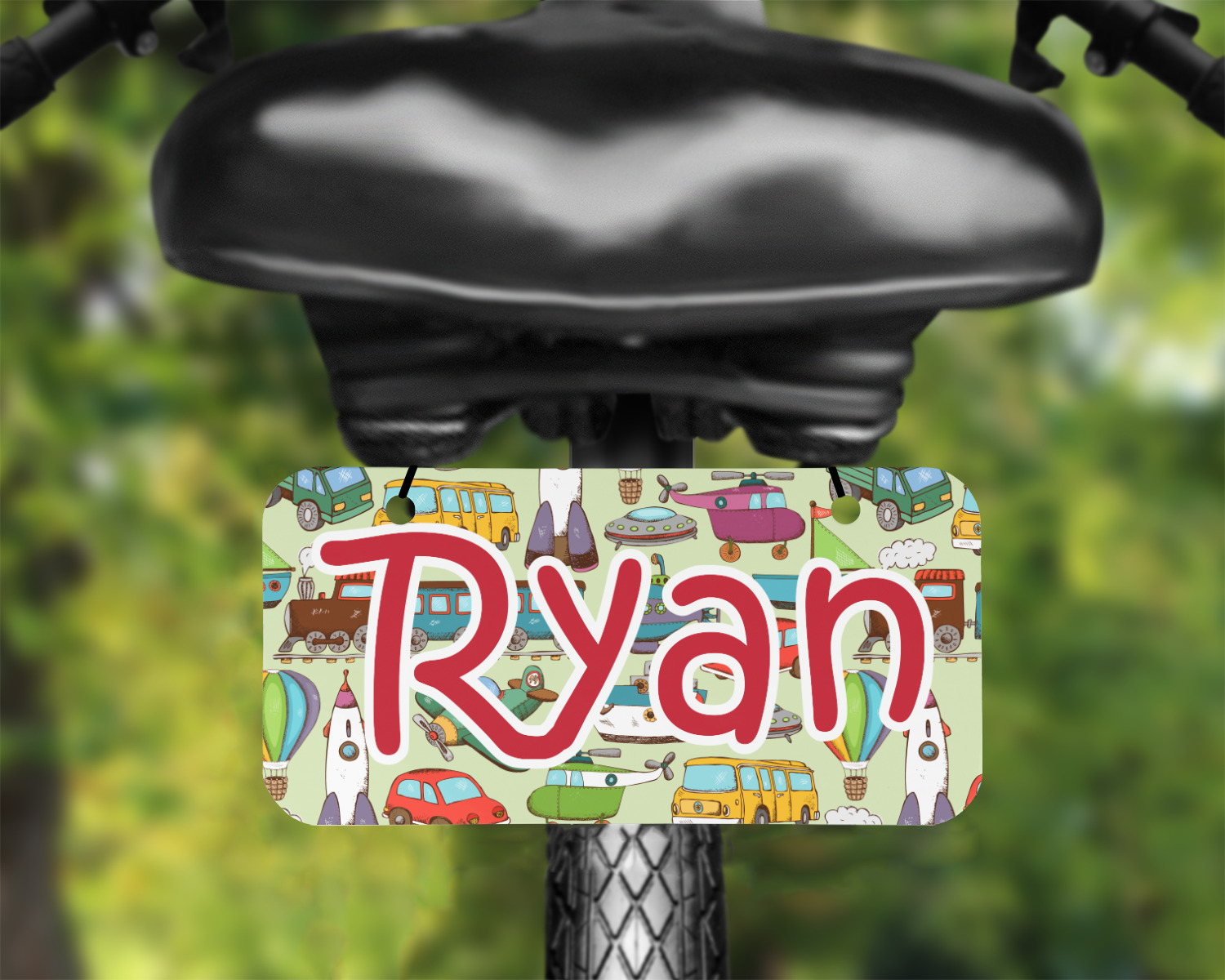 We have featured the various forms of transportation on a soft green background, with a classic red ribbon and square label. The label features a vintage hot air, along with a name for personalization.