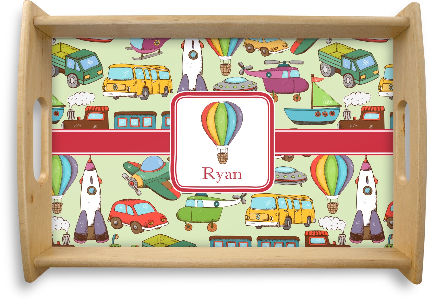 We have featured the various forms of transportation on a soft green background, with a classic red ribbon and square label. The label features a vintage hot air, along with a name for personalization.