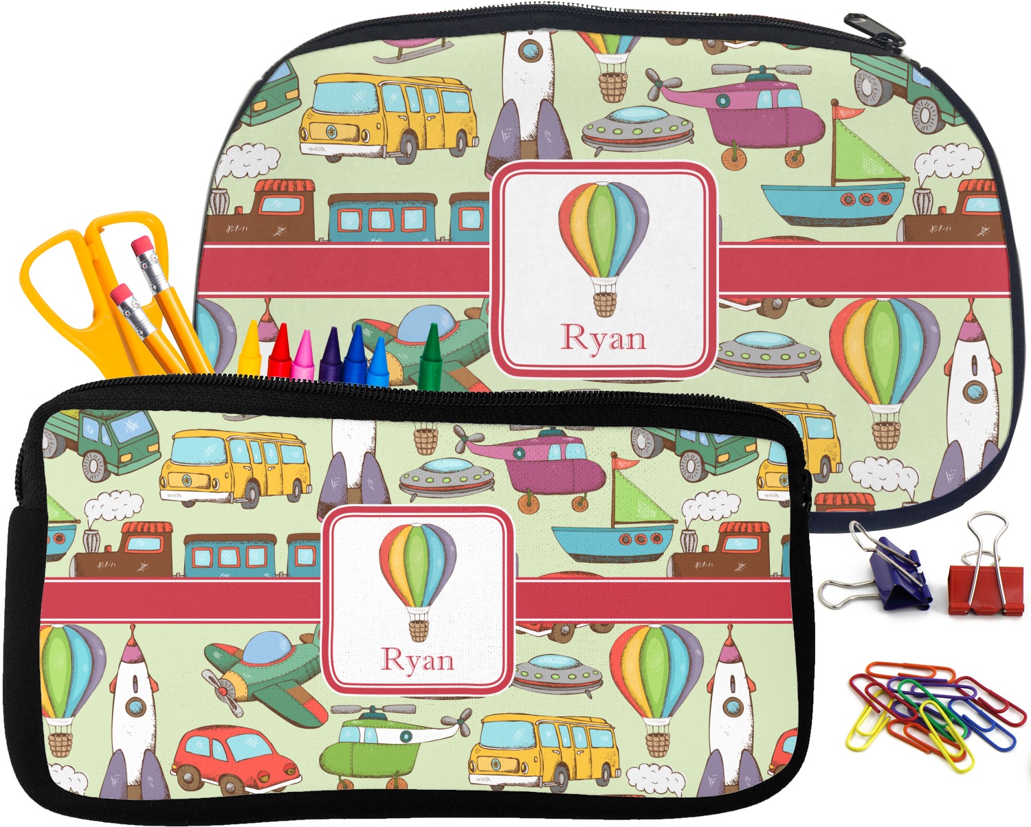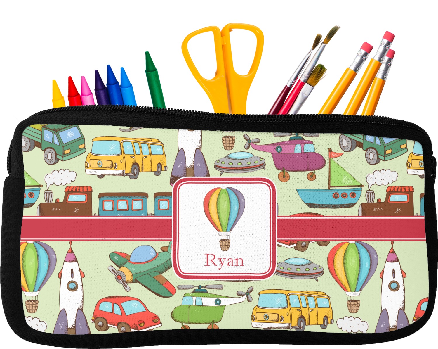 Built from durable neoprene, these pencil pouches, are water resistant, and prevent leaking ink from spilling into your backpack or purse. These custom pencil cases secure with a robust, black zipper. We print your personalized design on the front of this pouch, while the remaining sides a simple black color. These colored pencil cases [880] are sold in two sizes; our smaller version measures at 8.5 by 4.5 inches, while the medium measures at 10.5 by 6.5 inches. The smaller size is more suitable for holding pencils and pens, while our medium size can accommodate pencil sharpeners, scissors, and erasers.