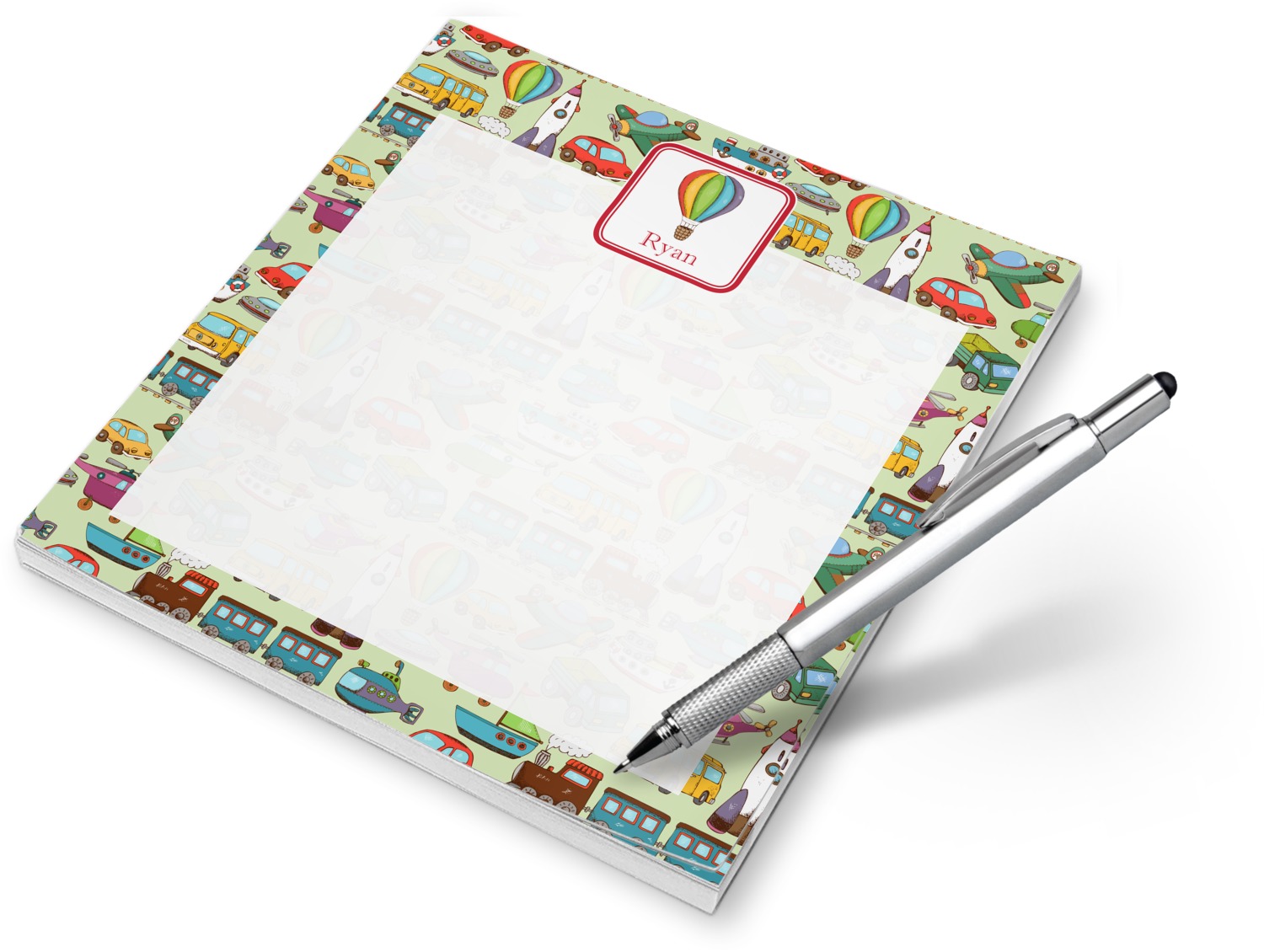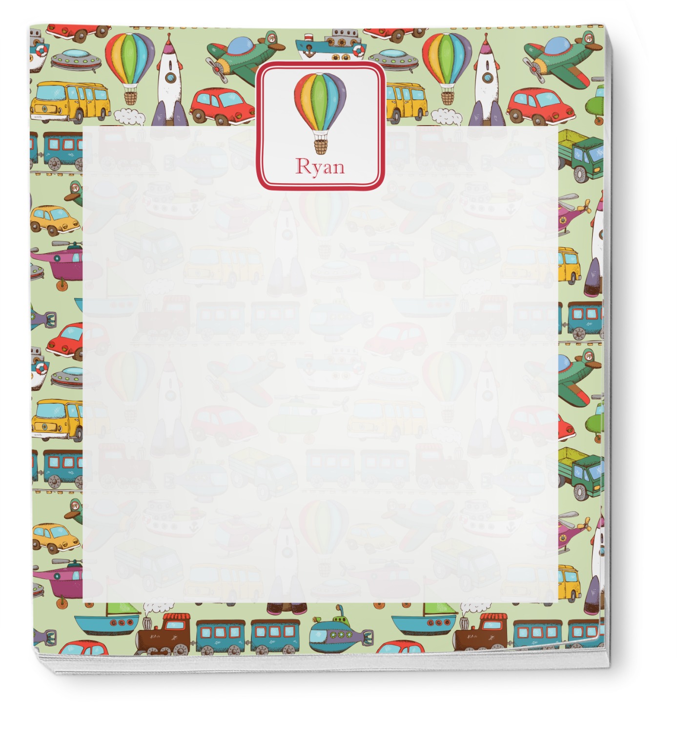 We have featured the various forms of transportation on a soft green background, with a classic red ribbon and square label. The label features a vintage hot air, along with a name for personalization.