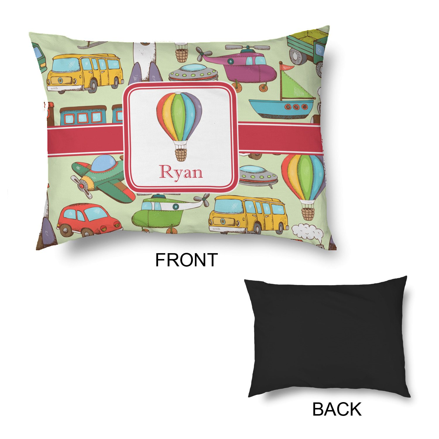 We have featured the various forms of transportation on a soft green background, with a classic red ribbon and square label. The label features a vintage hot air, along with a name for personalization.