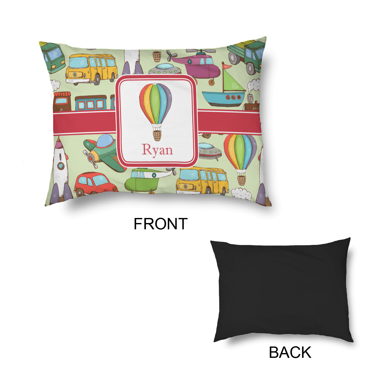 We have featured the various forms of transportation on a soft green background, with a classic red ribbon and square label. The label features a vintage hot air, along with a name for personalization.