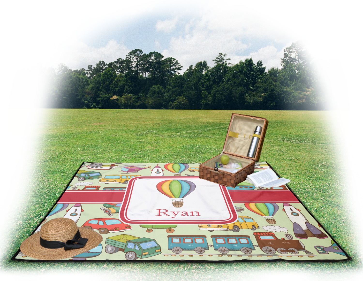 We have featured the various forms of transportation on a soft green background, with a classic red ribbon and square label. The label features a vintage hot air, along with a name for personalization.