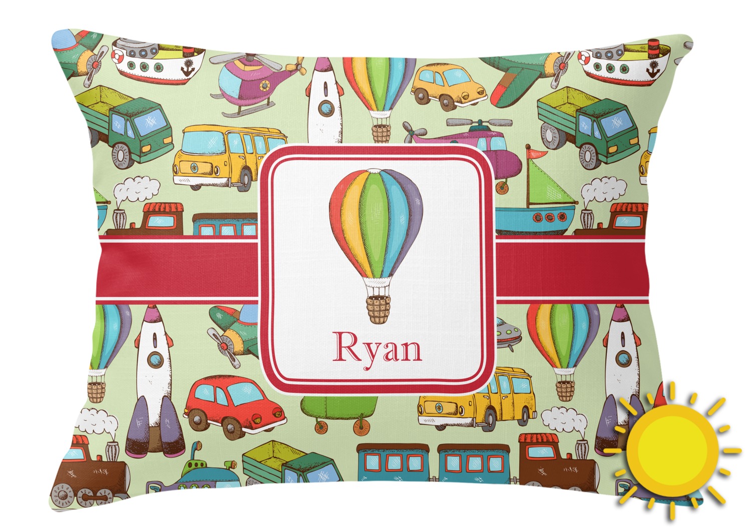 We have featured the various forms of transportation on a soft green background, with a classic red ribbon and square label. The label features a vintage hot air, along with a name for personalization.