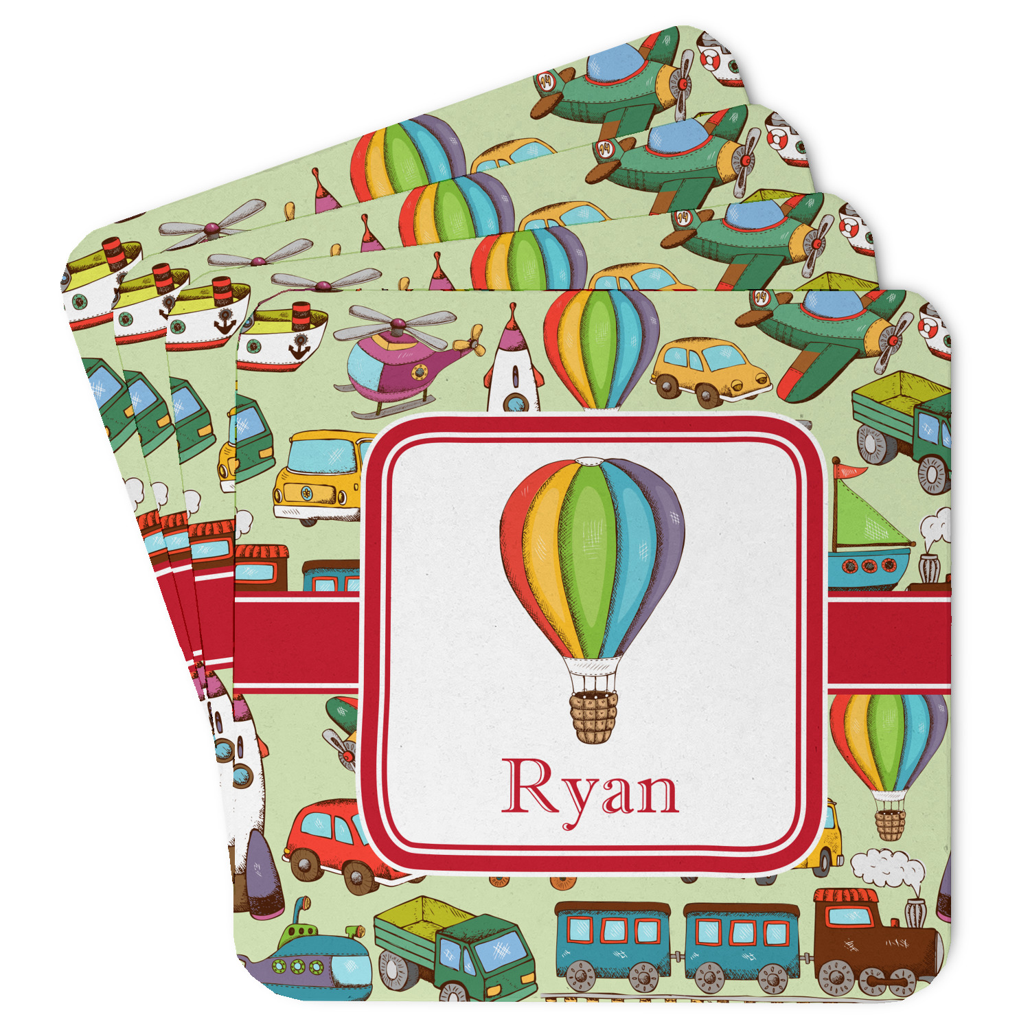 We have featured the various forms of transportation on a soft green background, with a classic red ribbon and square label. The label features a vintage hot air, along with a name for personalization.