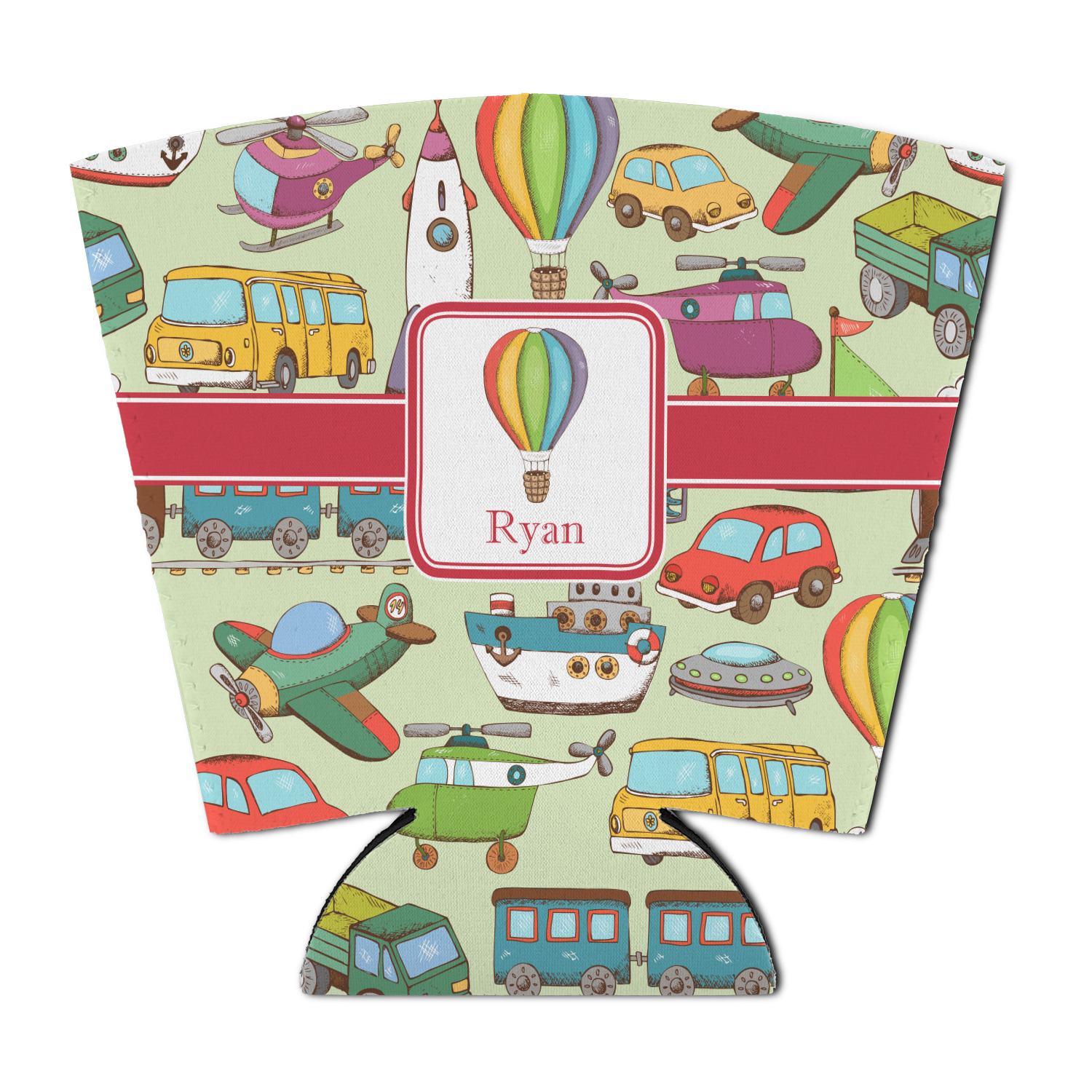 We have featured the various forms of transportation on a soft green background, with a classic red ribbon and square label. The label features a vintage hot air, along with a name for personalization.