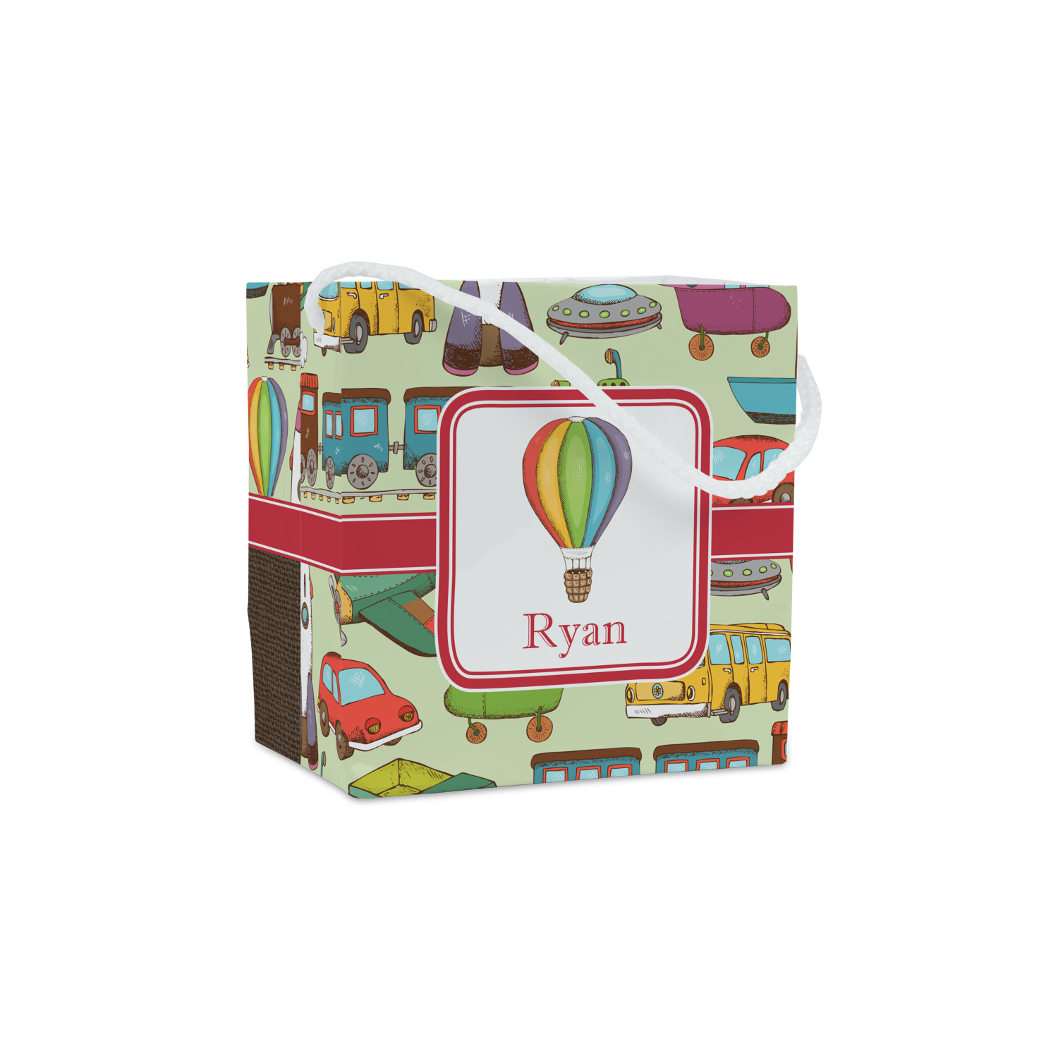 We have featured the various forms of transportation on a soft green background, with a classic red ribbon and square label. The label features a vintage hot air, along with a name for personalization.