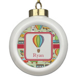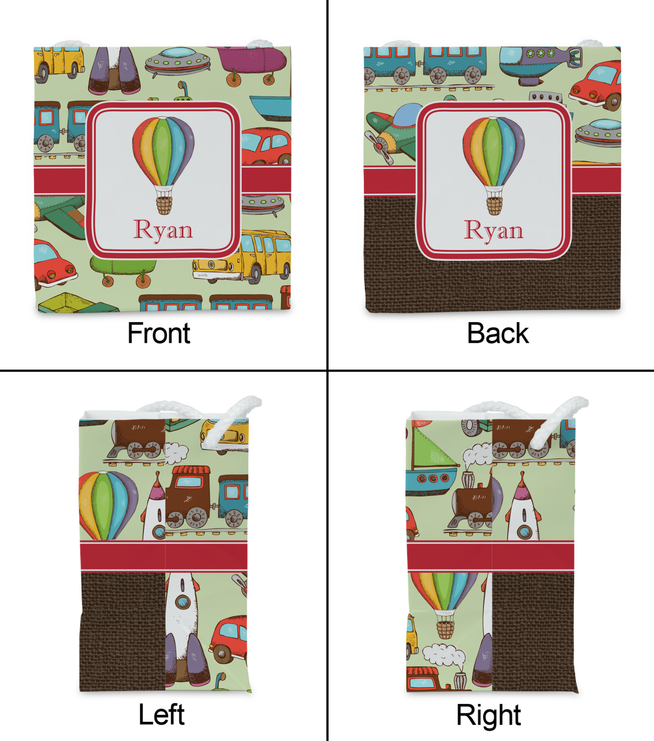 We have featured the various forms of transportation on a soft green background, with a classic red ribbon and square label. The label features a vintage hot air, along with a name for personalization.