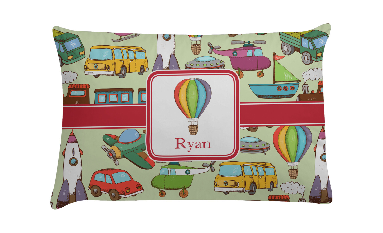 We have featured the various forms of transportation on a soft green background, with a classic red ribbon and square label. The label features a vintage hot air, along with a name for personalization.