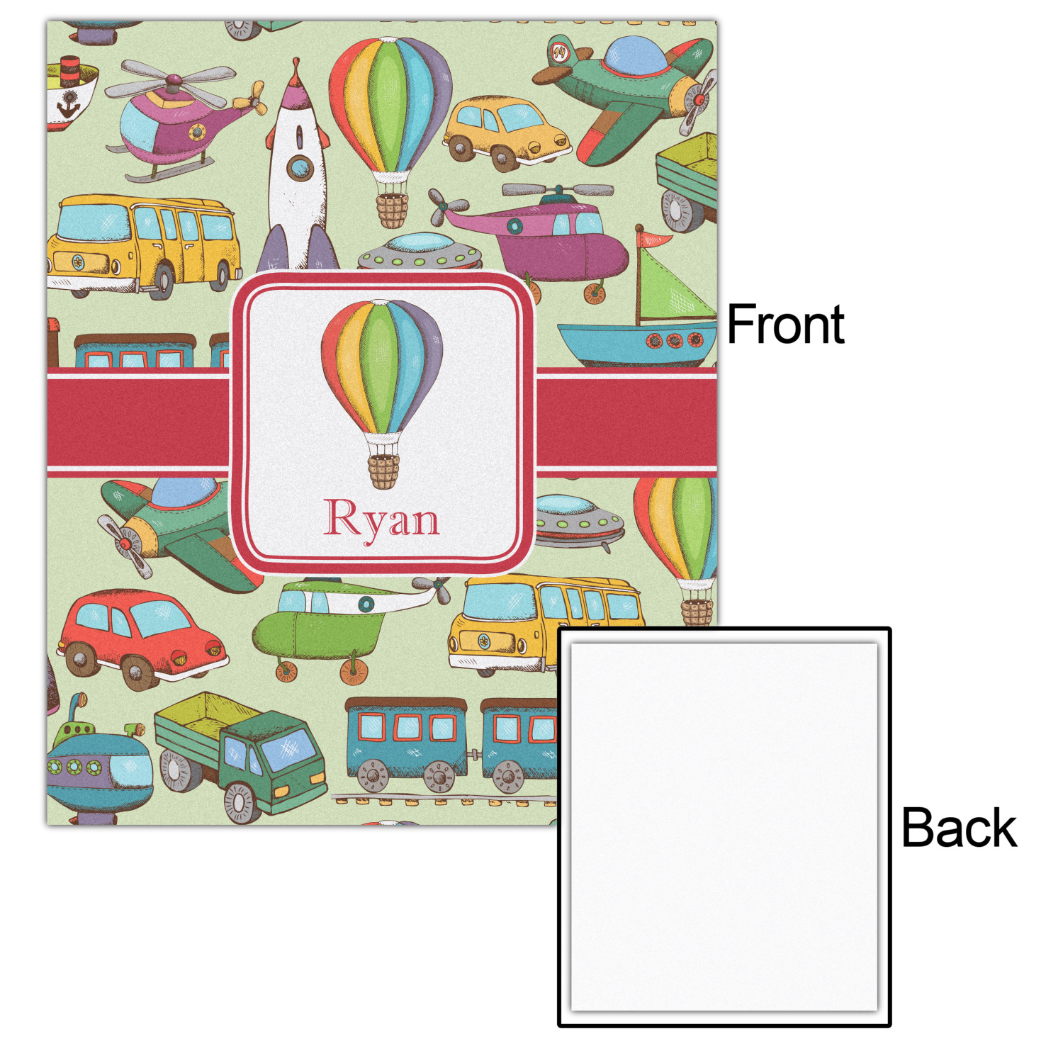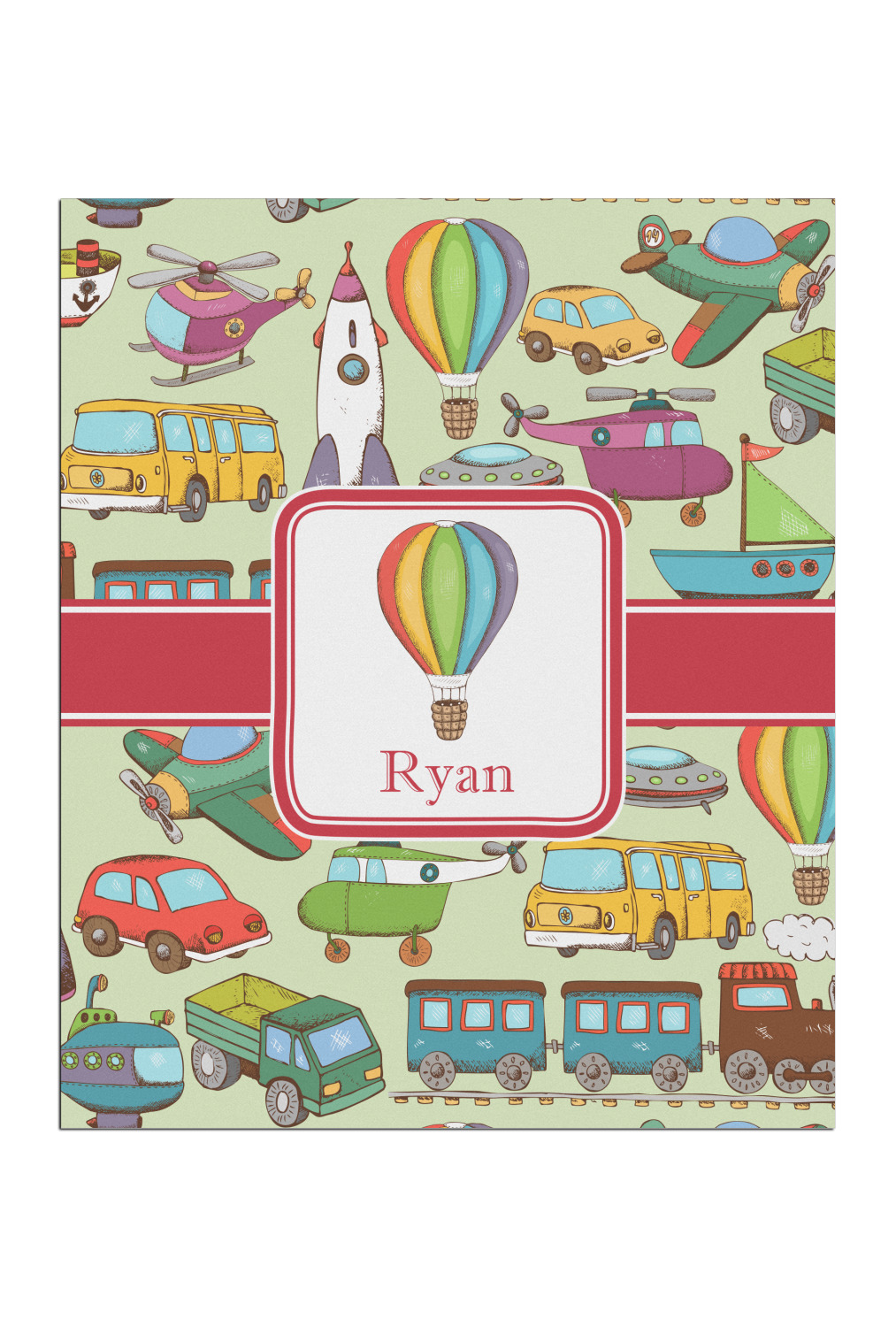 We have featured the various forms of transportation on a soft green background, with a classic red ribbon and square label. The label features a vintage hot air, along with a name for personalization.
