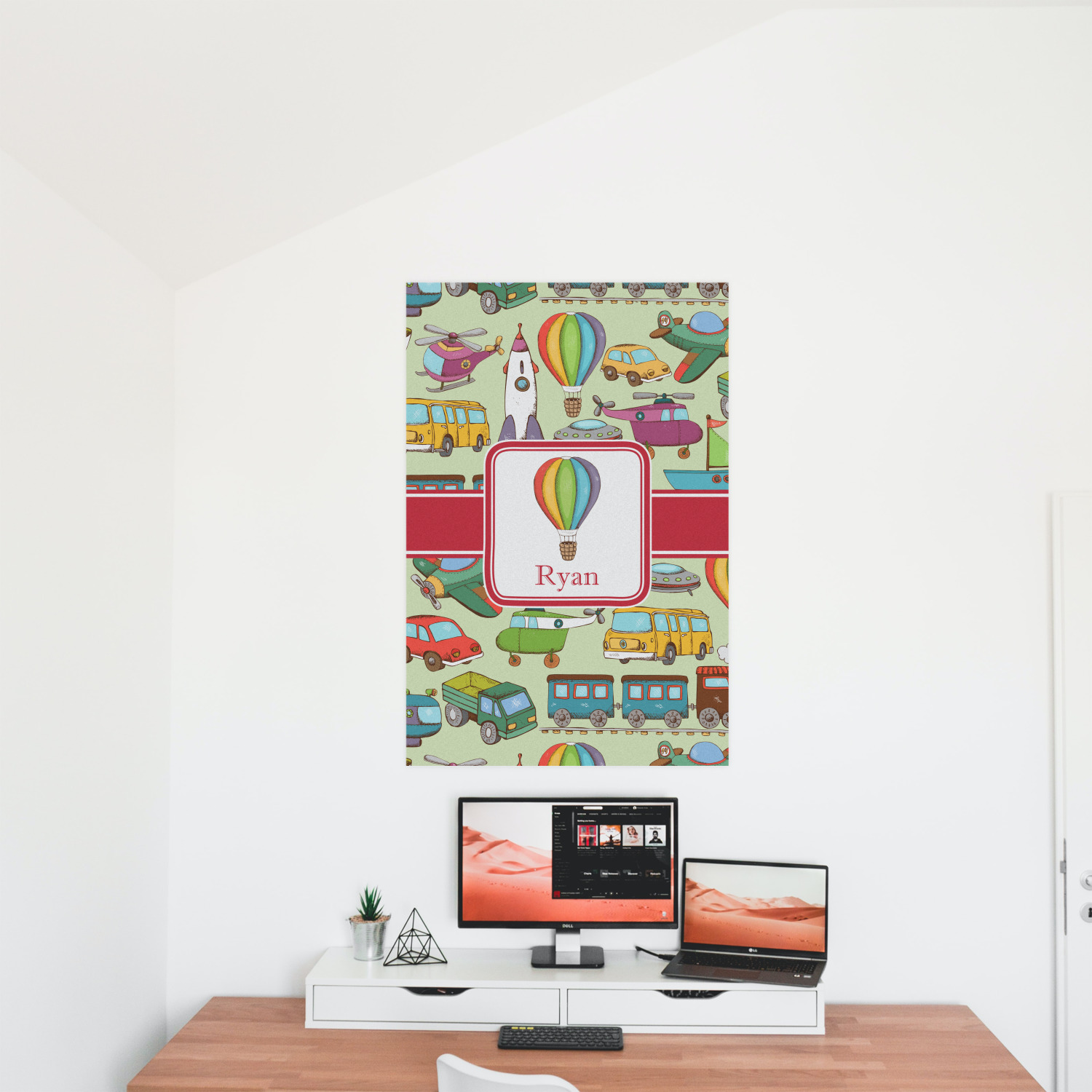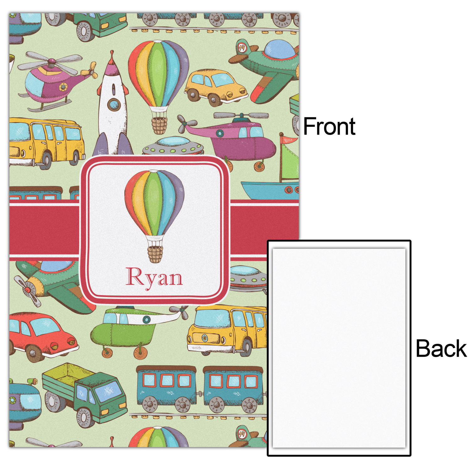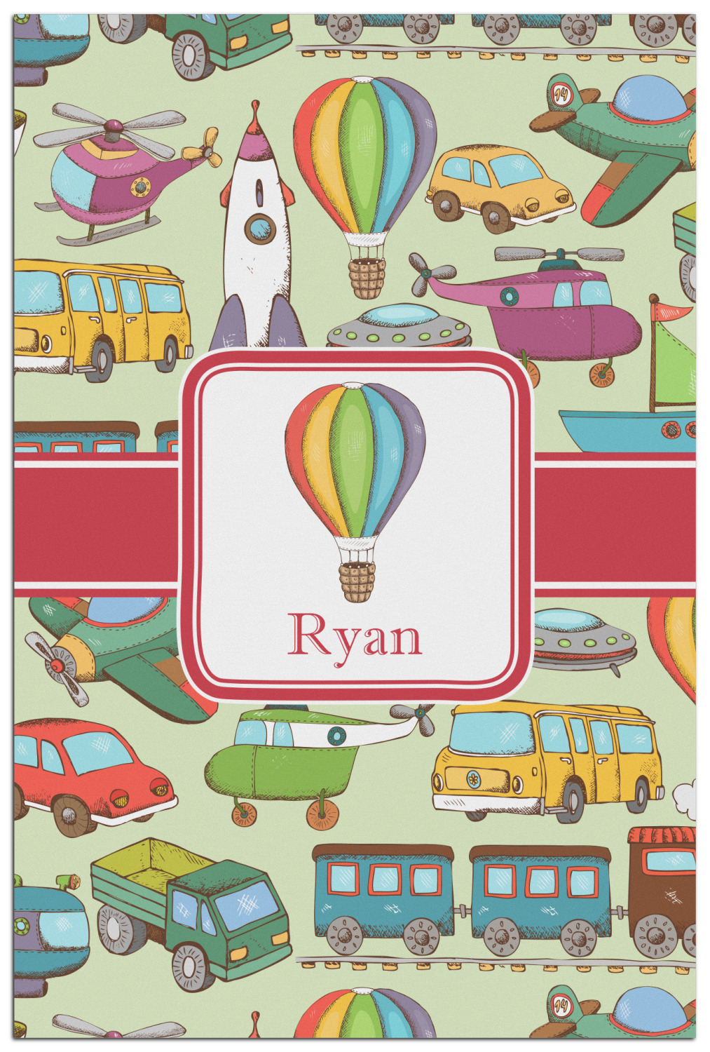 We have featured the various forms of transportation on a soft green background, with a classic red ribbon and square label. The label features a vintage hot air, along with a name for personalization.