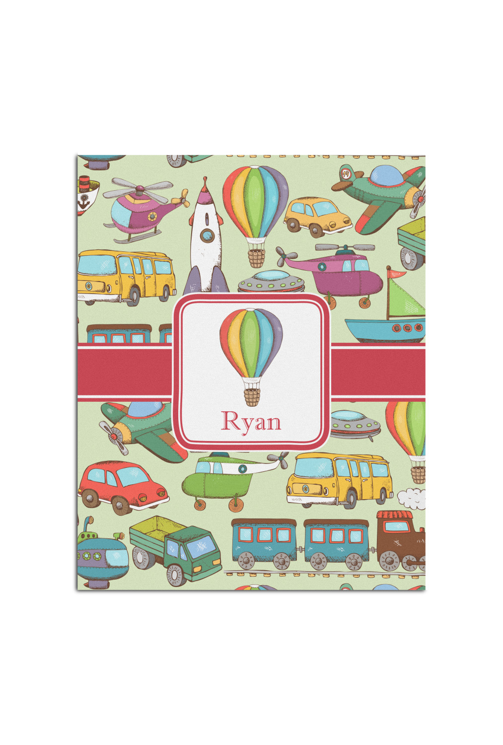 We have featured the various forms of transportation on a soft green background, with a classic red ribbon and square label. The label features a vintage hot air, along with a name for personalization.
