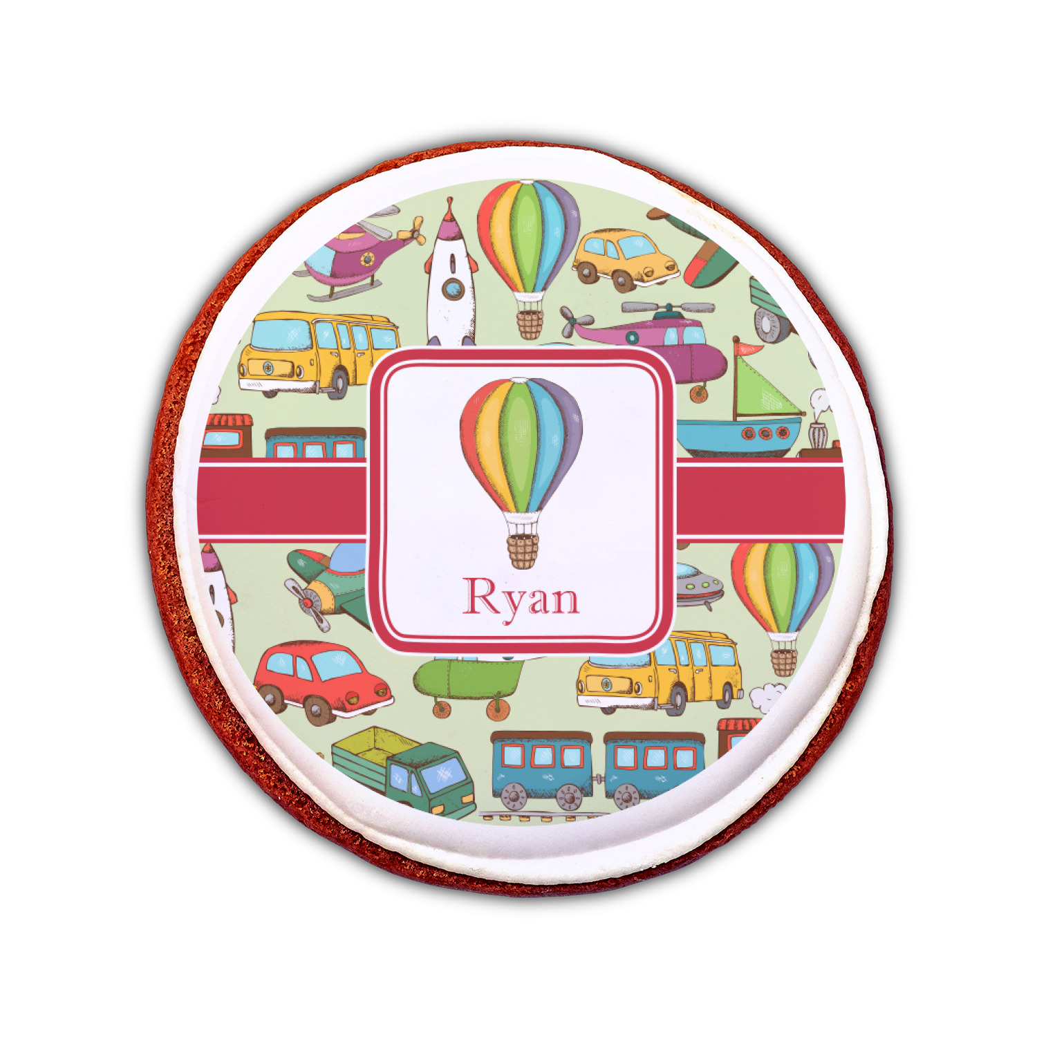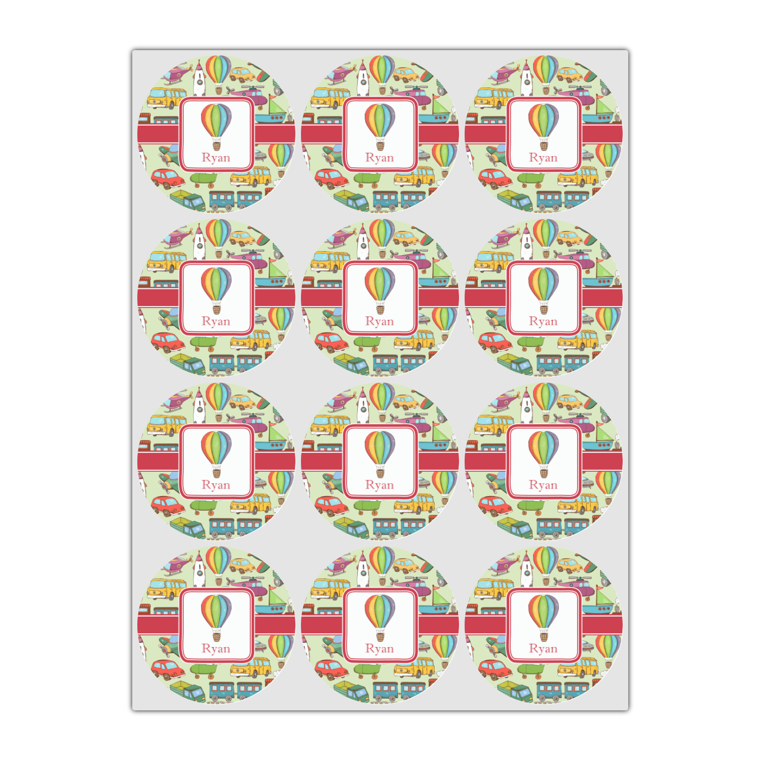 We have featured the various forms of transportation on a soft green background, with a classic red ribbon and square label. The label features a vintage hot air, along with a name for personalization.