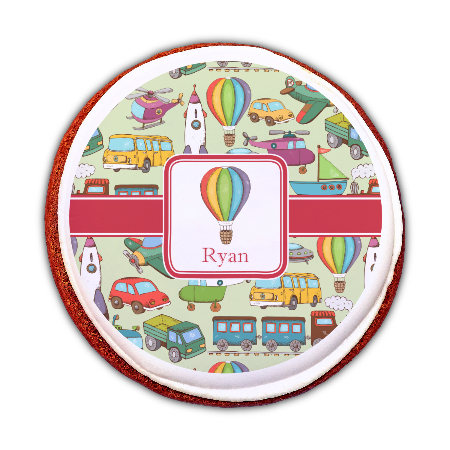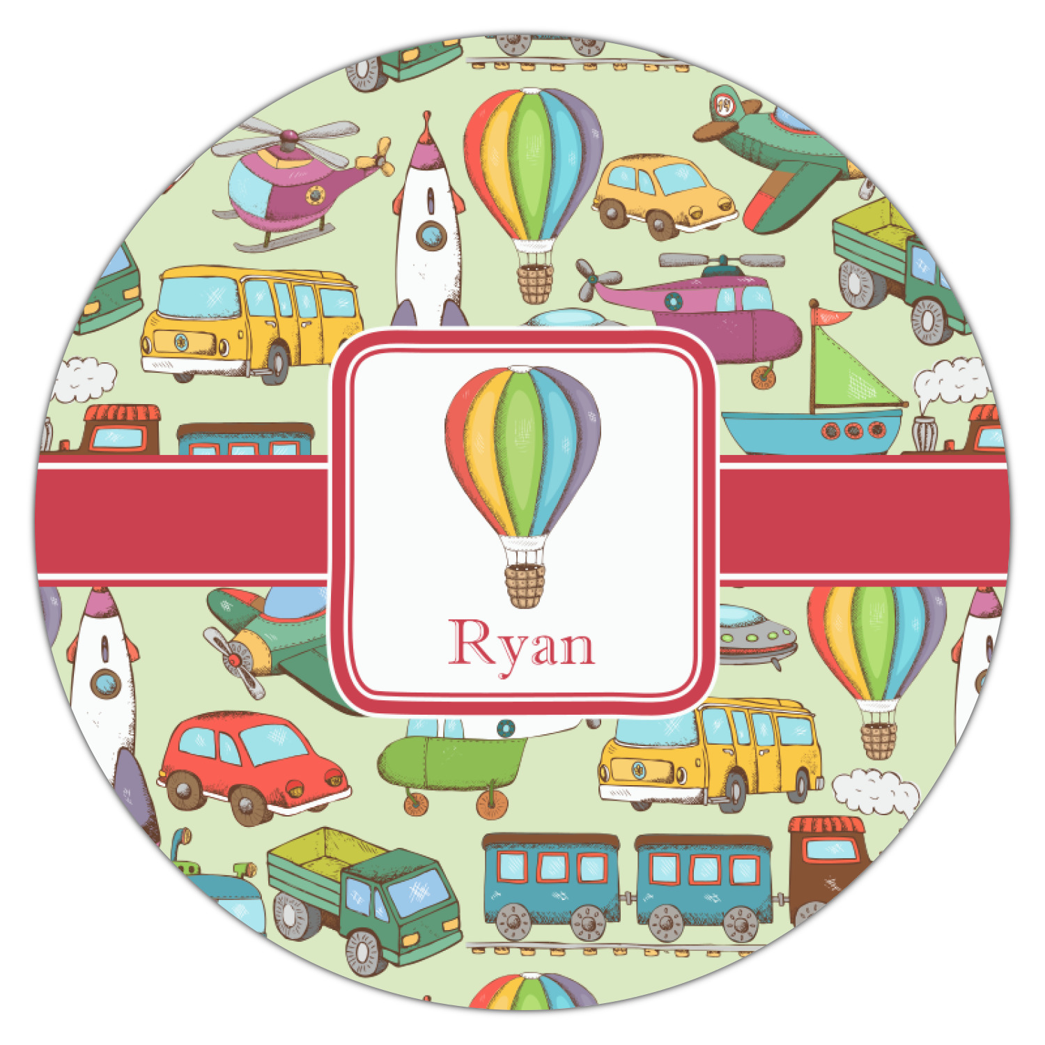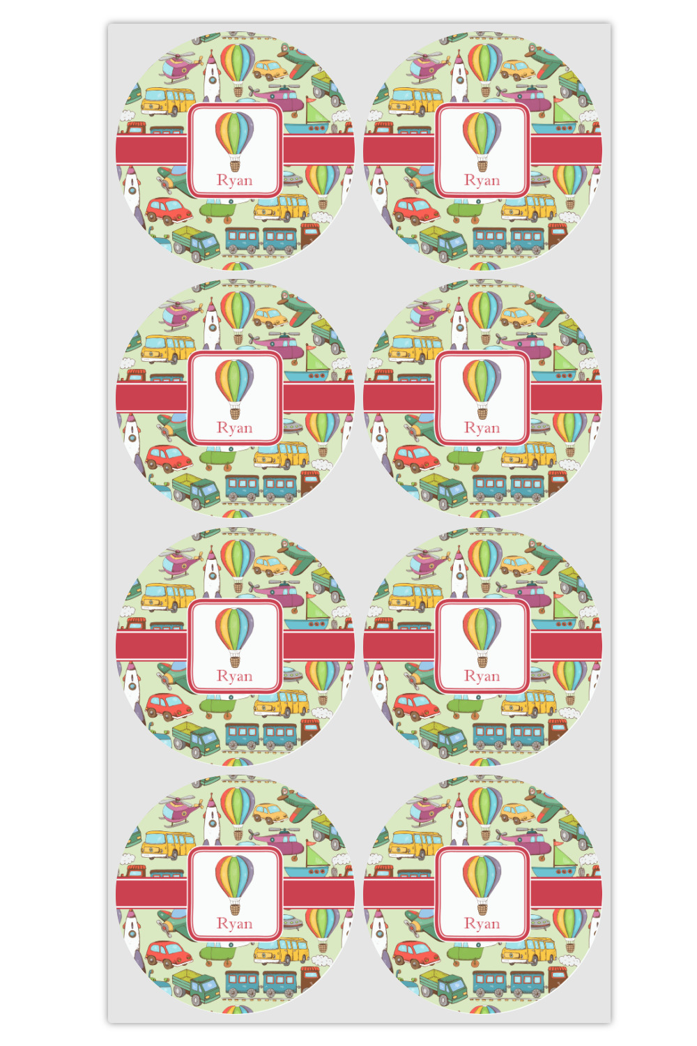 We have featured the various forms of transportation on a soft green background, with a classic red ribbon and square label. The label features a vintage hot air, along with a name for personalization.