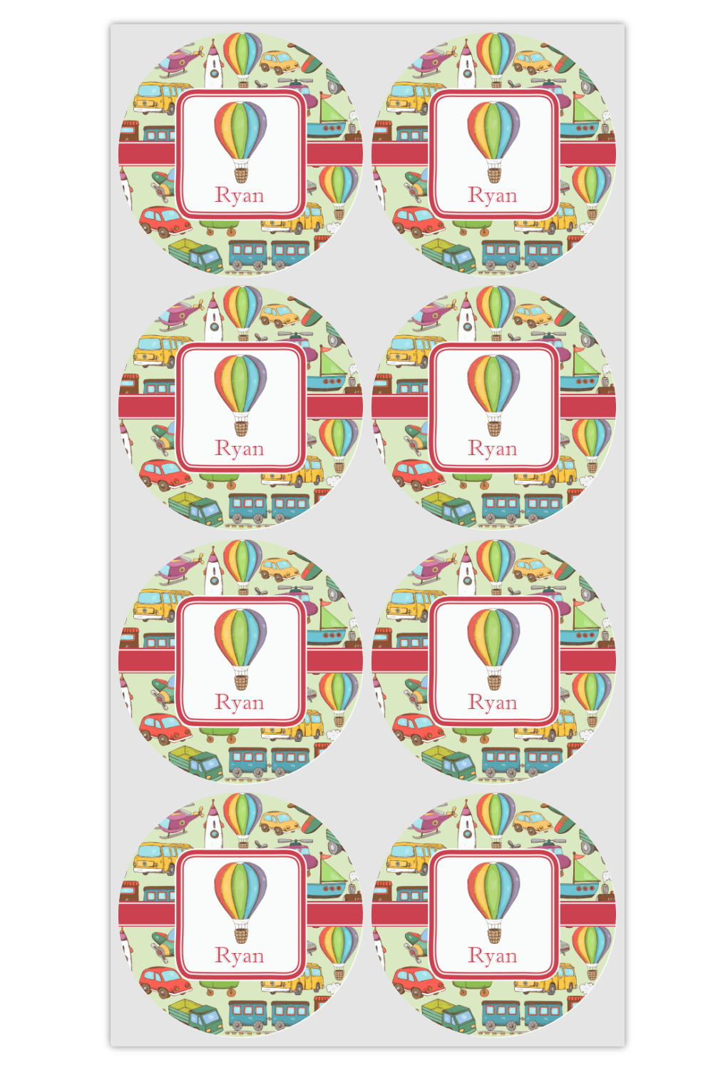 We have featured the various forms of transportation on a soft green background, with a classic red ribbon and square label. The label features a vintage hot air, along with a name for personalization.